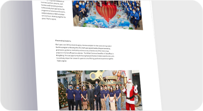 Working together for good. That’s original. Community Ambassador Nurturing a sense of local pride and bringing people together are hallmarks of Swire Properties unique approach to placemaking. A true community is one that takes care of everyone. For 20 years, Swire Properties Community Ambassador has brought together a network of business partners, tenants, staff, families and friends to give back to the society. Last year alone, the programme hosted over 60 events, and provided over 4800 volunteer service hours. Working together for good. That’s original. Placemaking Academy Each year, over 100 top students apply, interview and pitch for their place among a select few for a program unlike any other. For a half-year apprenticeship, they are teamed up, given space, guidance, mentorship and resources, to handle one of the most unique projects in the Swire Properties calendar - The White Christmas Street Fair at Taikoo Place in Hong Kong. This rare opportunity for the brightest and freshest minds to take the reins, aims to positively shape their careers for years to come. Putting youth and experience together. That’s original. Letting students run the show. That’s original.