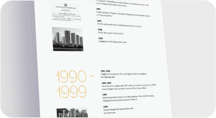 1972 Swire Properties was incorporated in Hong Kong with interests held by B & S Industries Limited and The Taikoo Dockyard and Engineering Company of 1970 - Hong Kong Limited (renamed as Swire Pacific Limited in 1974). 1975 Commencement of the redevelopment of the site vacated by the dockyard into one of Hong Kong’s first major private housing estates, to be known as 1989 Taikoo Shing 1978 Please change the design, Development of Brickell Key, a unique mixed-use community, located o! the coast of Miami, Florida in the United States 1983 can play with numbers Staged opening of Cityplaza, the largest shopping and entertainment centre on Hong Kong Island 1985 The Victoria Barracks site at Admiralty is purchased at auction 1988 Pacific Place opens to first tenants 1989 Completion of The Albany, Mid-Levels 1991–1992 Cityplaza Four opens in 1991, and Cityplaza Three is completed 1990 - the following year 1993–2003 Devon House is completed in 1993. In the next decade, Dorset House, PCCW Tower, Cityplaza One, Lincoln House and Oxford House follow 1999 1995 Swire Properties becomes a Founding Member of the HK-BEAM Society (Building Environmental Assessment Method) 1999 StarCrest begins the regeneration of the Star Street area "Taikoo place is eastern Hong Kong’s primary business district"