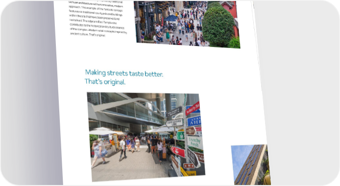 Modern retail inspired by ancient culture. That’s original. Sino-Ocean Taikoo Li Chengdu In a world struggling to protect tradition and cultural identity, Sino-Ocean Taikoo Li Chengdu is a breath of fresh air. Instead of the conventional tower approach, Taikoo Li Chengdu, designed by The Oval Partnership, architects of Taikoo Li Sanlitun, continued the ‘lane ’retail concept with a strong aesthetic directly inspired by traditional Sichuan architecture with an innovative, modern approach. This example of the Taikoo Li concept features six traditional courtyards and buildings within the site that have been preserved and revitalised. The adjacent Daci Temple also contributes to the historical and cultural essence of the complex. Modern retail concepts inspired by ancient culture. That’s original. Making streets taste better. That’s original. Tong Chong Street Market Tong Chong Street Market is a great example of how thinking outside of the box can transform neighbourhoods and communities. Established in 2016 as a way to promote a new and emerging culinary art form - gourmet street food. Tong Chong Street Market has grown be a haven for advocates and influencers of all things delicious as well as healthy and sustainable approaches to growing, cooking, reposting and recycling food. Each market-day is a vibrant, social event featuring everything from fresh farmers’ produce to creative dishes, cooking tips, and the latest food and beverage trends. Making streets taste better. That’s original.