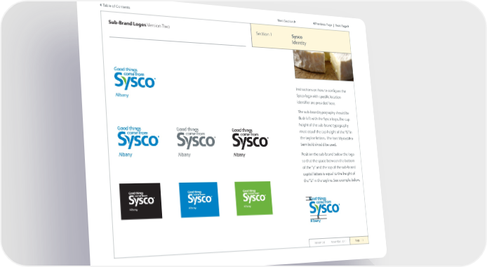 Table of Contents Next Section Previous Page | Next Page Sub-Brand Logos Version Two Section 1 Sysco Identity Instructions on how to con昀椀gure the Sysco logo with speci昀椀c location Albany identi昀椀er are provided here. The sub-brand typography should be 昀氀ush left with the Sysco logo. The cap height of the sub-brand typography must equal the cap height of the “G” in the tagline letters. The font Myriad Pro Semibold should be used. Albany Albany Albany Position the sub-brand below the logo so that the space between the bottom of the ”y” and the top of the sub-brand capital letters is equal to the height of the “G” in the tagline. See example below. A Albany Albany Albany A Albany Version 5.0 November 2011 Page 11