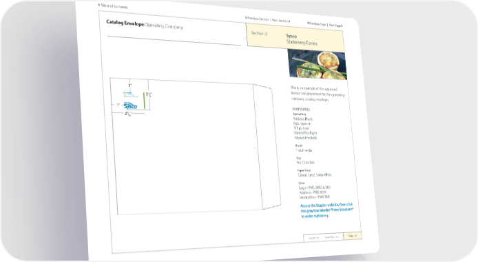 Table of Contents Previous Section | Next Section Previous Page | Next Page Catalog Envelope Operating Company Section 2 Sysco Stationery/Forms This is an example of the approved 1” format and placement for the operating Sysco Albany 1 company catalog envelope. One Liebich Lane 2/” Halfmoon, NY 12065-1421 4 1” PRINTER SPECS Typesetting 9 2/ ” Address Block 16 8 pt. type on 9.5 pt. lead Myriad Pro Light Myriad Pro Bold Brand 1 inch wide Size 9 x 12 inches Paper Stock Classic Crest, Solar White Color Logo - PMS 3005 & 369 Address - PMS 3005 Vertical bar - PMS 369 Access the Staples website, then click the gray box labeled “Print Solutions” to order stationery. Version 5.0 November 2011 Page 36