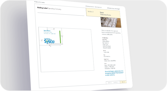 Table of Contents Previous Section | Next Section Previous Page | Next Page Mailing Label Operating Company Section 2 Sysco Stationery/Forms 1 This is an example of the approved /” 4 format and placement for the operating Sysco Albany One Liebich Lane company mailing label. Halfmoon, NY, 12065-1421 1 1/” PRINTER SPECS 2 Typesetting 1 Address Block /” 2 8 pt. type on 9.5 pt. lead 1 Myriad Pro Light 2/ ” 16 Myriad Pro Bold Brand 1 inch wide Size 5.5 x 4 inches Paper Stock Classic Crest, Solar White Color Logo - PMS 3005 & 369 Address - PMS 3005 Vertical bar - PMS 369 Access the Staples website, then click the gray box labeled “Print Solutions” to order stationery. Version 5.0 November 2011 Page 40