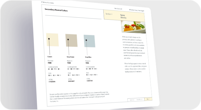 Table of Contents Next Section Previous Page | Next Page Secondary Neutral Colors Section 1 Sysco Identity While you should always use the primary color palette in any Sysco communications, we have made this secondary portfolio of colors available to give you more 昀氀exibility on certain uses. These colors should only be used for backgrounds on promotional materials, in-house publications Cream Gray Green Gray Blue and online. Pantone Pantone Pantone 7500 7535 7542 When the logo appears over a neutral 4 color process 4 color process 4 color process color, use the approved blue and green C0 M2 Y15 K3 C0 M3 Y15 K20 C10 M0 Y3 K16 version. These colors can be used for RGB RGB RGB backgrounds in all mediums. R247 G237 B212 R211 G202 B183 R194 G209 B211 HTML HTML HTML F7EDD4 D3CAB7 C3D1D3 Do not use the color squares on this page for a visual match. The colors shown on this page may not be visually accurate due to the calibration of your computer monitor or printer. Please consult the current Pantone® formula guide to see the accurate color. Pantone® is the property of Pantone, Inc. Version 5.0 November 2011 Page 17
