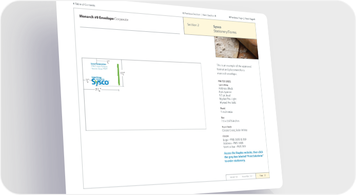 Table of Contents Previous Section | Next Section Previous Page | Next Page Monarch #9 Envelope Corporate Section 2 Sysco Stationery/Forms 1 This is an example of the approved /” Sysco Corporation 4 format and placement for a 1390 Enclave Parkway Houston, Texas 77077 monarch envelope. 1 1/” 2 PRINTER SPECS 1 /” Typesetting 2 Address Block 1 8 pt. type on 2/ ” 16 9.5 pt. lead Myriad Pro Light Myriad Pro Bold Brand 1 inch wide Size 7.5 x 3.875 inches Paper Stock Classic Crest, Solar White COLOR Logo - PMS 3005 & 369 Address - PMS 3005 Vertical bar - PMS 369 Access the Staples website, then click the gray box labeled “Print Solutions” to order stationery. Version 5.0 November 2011 Page 33