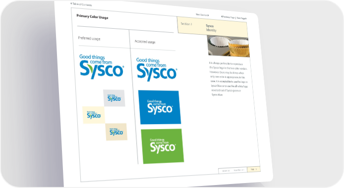 Table of Contents Next Section Previous Page | Next Page Primary Color Usage Section 1 Sysco Identity Preferred usage Accepted usage It is always preferable to reproduce the Sysco logo in the two color version. However, there may be times when only one color is appropriate. In this case, it is acceptable to use the logo in Sysco blue or to use the all-white logo reversed out of Sysco green or Sysco blue. Version 5.0 November 2011 Page 19
