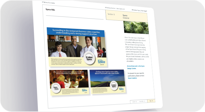 Table of Contents Previous Section | Next Section Previous Page | Next Page Sysco Ads Section 3 Sysco External One of the best ways to build your sales while building the Sysco brand is by using striking advertising. The ads shown here represent the proper image, tone and messaging of the Sysco brand. They are strong communications tools, they are approved by Sysco, and they are ready for you to use. Horizontal, vertical, color and black & white versions are all available. Access these ads in the Sysco Design Center. To size ads for your speci昀椀c publication, please contact Xenn Creative. Version 5.0 November 2011 Page 48