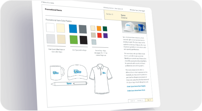 Table of Contents Previous Section | Next Section Previous Page | Next Page Promotional Items Section 3 Sysco External Promotional Item Color Palette Specialty items have many uses, from customer gifts to event promotions to employee spirit. The Sysco logo can be applied to a variety of objects; the most important guideline is to maintain color and spacing speci昀椀cations. Use Sysco blue logo or Use Sysco white logo Secondary colors two color logo see pages 16 - 17 for The secondary color portfolio shown correct logo use here is available to give you more 昀氀exibility on certain uses. These colors should be used primarily as highlights for promotional materials, in-house publications and online graphics. There are unique events when a di昀昀erent base color is appropriate. For example, you may want to produce a pink hat for a breast cancer event. In these rare cases, the all-white version of the Sysco logo should always be used. Order Sysco items from Staples. Order Sysco items from HALO. Version 5.0 November 2011 Page 53