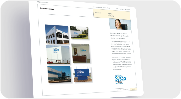 Table of Contents Previous Section | Next Section Previous Page | Next Page External Signage Section 3 Sysco External Instructions on how to con昀椀gure the Sysco logo with speci昀椀c location identi昀椀er are provided here. The city identi昀椀er typography should always be 昀氀ush left with the Sysco logo. The cap height of the identi昀椀er typography must always equal the cap height of the tagline letters. The font Myriad Pro Semibold should be used. Position the city identi昀椀er below the logo so that the space between the bottom of the ”y” and the top of the identi昀椀er capital letters is equal to the height of the “G” in the tagline. See example below. G G Sysco Houston Version 5.0 November 2011 Page 54