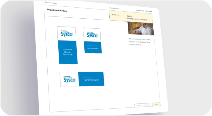 Table of Contents Previous Section Previous Page | Next Page Department Markers Section 4 Sysco Internal Communications When creating department markers, be sure to be consistent and follow spacing guidelines. Human Resources Human Resources Human Resources Version 5.0 November 2011 Page 57