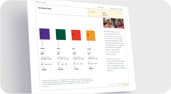 Table of Contents Next Section Previous Page | Next Page Secondary Colors Section 1 Sysco Identity While you should always use the primary color palette in any Sysco communications, we have made this secondary portfolio of colors available to give you more 昀氀exibility on certain uses. These colors should only be used as highlights on promotional materials, in-house publications and online Purple Green Red Orange graphics – a good example is Pantone Pantone Pantone Pantone the orange box on the Sysco 2597 554 1795 144 website homepage. 4 color process 4 color process 4 color process 4 color process C85 M100 Y0 K0 C78 M0 Y63 K67 C0 M94 Y100 K0 C0 M48 Y100 K0 When the logo appears over a RGB RGB RGB RGB secondary color, the all-white version R82 G46 B145 R0 G84 B61 R238 G52 B36 R248 G152 B29 should always be used. Secondary HTML HTML HTML HTML colors are not approved for apparel 522E91 00543D c15b5d F8981D colors except for special circumstances. See page 53. Do not use the color squares on this page for a visual match. The colors shown on this page may not be visually accurate due to the calibration of your computer monitor or printer. Please consult the current Pantone® formula guide to see the accurate color. Pantone® is the property of Pantone, Inc. Version 5.0 November 2011 Page 16