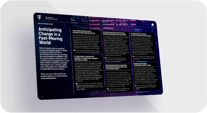 ESG and Industry Trends Anticipating Change in a Fast-Moving World Both our industry and our world are moving and changing quickly. T-Mobile is positioned at the forefront of technologies driving change, including the transformational capabilities of 5G. Through innovation, investment, and a constant eye on emerging trends, we can better deliver on both the current and future needs of our customers, while never losing sight of our commitment to responsible business practices. These are some of the key ESG and industry trends on our radar and how we are tackling them. CUSTOMER SATISFACTION IS GROWING EVER MORE IMPORTANT In an era of 24/7 connectivity, delivering on customer expectations is more important than ever. That’s why the customer-obsessed heroes who make up Team Magenta are our most powerful differentiator. Because of their dedication to our customer-first approach, T-Mobile is consistently recognized for providing amazing customer service across our flagship brand, T-Mobile, and our prepaid brand, Metro by T-Mobile. Find out more about what makes Team Magenta and our culture different in our Culture section . IT TAKES PUBLIC AND PRIVATE SUPPORT TO ADEQUATELY ADDRESS THE DIGITAL DIVIDE Internet infrastructure is an essential part of a digitally inclusive society, but it’s just one piece of the puzzle. Affordability, access, and digital proficiency are all important factors that require action from both the private sector and government. As the U.S. takes steps to close the digital divide, including a $65 billion investment to improve broadband infrastructure through the American Jobs Plan, at T-Mobile, we’re continuing our critical efforts to support digital equity through our five-year $10.7B Project 10Million commitment. Find out more about how T-Mobile is supporting digital inclusion and empowerment and connecting millions of students who lack home internet through Project 10Million . EVOLVING EMPLOYEE EXPECTATIONS REDEFINE PRIORITIES FOR COMPANIES Not surprisingly, the last two years have had a profound impact on employee health, well-being, and engagement. Navigating the pandemic and resulting personal, family, and professional stressors have impacted everything from employee health and wellness to workplace expectations. At T-Mobile we’ve always prioritized our employees and take the time to listen to their feedback on a range of topics, including workplace flexibility, health and safety, and career development. We have doubled-down on opportunities for career growth and increased mental health offerings, among other investments. Find out more about how we enable Team Magenta to thrive through DE&I initiatives and learning and career development . TELECOMMUNICATION COMPANIES PRIORITIZING MORE EFFICIENT AND SUSTAINABLE ENERGY Telcos in the U.S. and overseas are accelerating their actions on climate and sustainability. An important area of focus is around sustainable energy management, which includes shifting to renewable sources of power, adopting energy-efficient measures and new technology available for 5G networks, and developing services that allow customers to reduce their carbon footprint, such as Work From Anywhere and Internet of Things (IoT) solutions, fleet management, and device recycling. Find out more about our sustainable energy management and device recycling work . 5G INNOVATION IS OPENING UP NEW ECONOMIC OPPORTUNITIES 5G’s faster speeds and greater bandwidth are powering incredible innovation potential and economic gains. In fact, it is forecasted that 5G’s impact on the global economy will count for more than $1.3 trillion by 2030 ii . Not only can the power of 5G help companies grow their businesses, but it can also fundamentally change the way some industries operate. We can expect to see transformations fueled by 5G in manufacturing, healthcare, financial services, utilities, and of course, consumer and media applications. Find out more about how T-Mobile is responding and contributing to 5G-powered innovation in the next section. THE ENVIRONMENT THE NUMBERS AND SMALL PRINT OUR GOVERNANCE OUR COMMUNITIES OUR PEOPLE 2021 CORPORATE RESPONSIBILITY REPORT 10 O OU U R R C C OM OMP PA A NY NY BUILDING RESPONSIBLE, TRANSPARENT SUPPLY CHAINS Recent years have continued to underscore the importance of responsible supply chain management. Our suppliers are key partners in our business and we actively engage with them to establish clear expectations and understand where we can better collaborate to improve the environmental and social impact of our supply chain. We are committed to developing a supplier base that reflects our core values, demonstrates strong ethical business, and represents the diverse customers and communities we serve. Find out more about how T-Mobile manages a responsible supply chain and supports diverse s uppliers . ii PwC, 2020. The global economic impact of 5G .