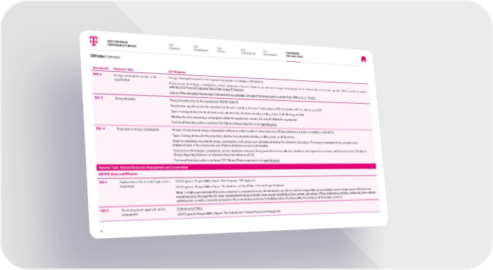 Disclosure# Disclosure Topic 2021 Response 302-2 Energy consumption outside of the organization Energy consumption outside of the organization, in joules or multiples: 7,875,945 GJ Standards, methodologies, assumptions, and/or calculation tools used: Downstream customer energy consumption data is estimated based on device-specific LCA data and in accordance with the GHG Protocol Corporate Value Chain (scope 3) Standard. Source of the conversion factors used: Standard and recognizable conversion factors are used to convert from MWh to GJ (x * 3.600). 302-3 Energy intensity Energy intensity ratio for the organization: 349.39 MWh/PB Organization-specific metric (the denominator) chosen to calculate the ratio: Total petabytes (PB) of network traffic for calendar year 2021 Types of energy included in the intensity ratio; whether fuel, electricity, heating, cooling, steam, or all: All energy in MWh Whether the ratio uses energy consumption within the organization, outside of it, or both: Within the organization For more information, refer to our latest CDP Climate Change response on our reporting page . 302-4 Reduction of energy consumption Amount of reductions in energy consumption achieved as a direct result of conservation and efficiency initiatives, in joules or multiples: 2,025,485 GJ Types of energy included in the reductions; whether fuel, electricity, heating, cooling, steam, or all: Electricity Basis for calculating reductions in energy consumption, such as base year or baseline, including the rationale for choosing it: The energy consumption in the year prior to the implementation of the conservation and efficiency initiatives is used as the baseline. Standards, methodologies, assumptions, and/or calculation tools used: Energy reduction data is collected, calculated, and reported in accordance with the most recent CDP Climate Change Reporting Guidance for Emissions Reduction Initiatives (C4.3). For more information, refer to our latest CDP Climate Change response on our reporting page . Material Topic: Natural Resources Management and Conservation GRI 303: Water and Effluents 103-1 Explanation of the material topic and its Boundaries 2021 Corporate Responsibility Report: Our Company > ESG Approach 2021 Corporate Responsibility Report: The Numbers and Small Print > Material Topic Definitions While T-Mobile uses relatively little water compared to companies in many other industries, we strive to use it in a responsible and sustainable manner to help conserve this important natural resource. Our reporting for water consumption includes domestic water used in our buildings (data centers, call centers, offices, retail stores, switches, warehouse), some cell sites with irrigation, as well as domestic wastewater. We do not include water use for buildings where the water utility is not included in the leasing contracts. 103-2 The management approach and its components 2021 CORPORATE OUR OUR OUR THE THE NUMBERS RESPONSIBILITY REPORT GOVERNANCE PEOPLE COMMUNITIES ENVIRONMENT AND SMALL PRINT GRI Index Continued Environmental Policy 2021 Corporate Responsibility Report: The Environment > Natural Resources Management 76 OUR COMPANY