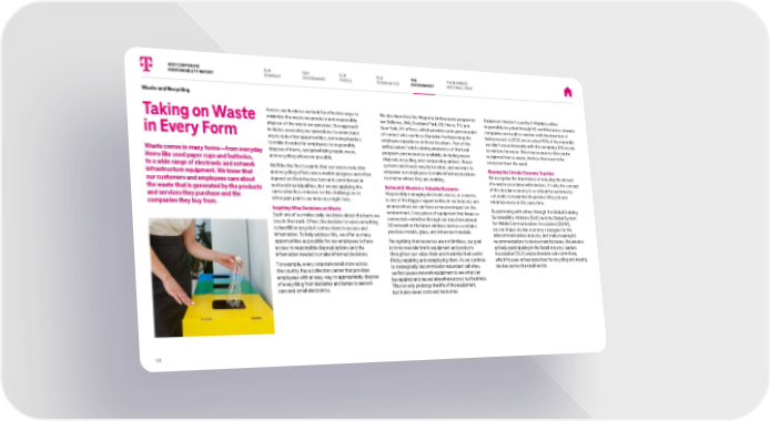 OUR COMPANY OUR GOVERNANCE OUR PEOPLE OUR COMMUNITIES THE ENVIRONMENT THE NUMBERS AND SMALL PRINT Waste and Recycling Taking on Waste in Every Form Waste comes in many forms—from everyday items like used paper cups and batteries, to a wide range of electronic and network infrastructure equipment. We know that our customers and employees care about the waste that is generated by the products and services they purchase and the companies they buy from. Across our business we look for effective ways to minimize the waste we produce and responsibly dispose of the waste we generate. Our approach includes assessing our operations to understand waste reduction opportunities, removing barriers to make it easier for employees to responsibly dispose of items, and prioritizing repair, reuse, and recycling whenever possible. We’ll be the first to admit that our waste reduction and recycling efforts are a work in progress and often depend on the infrastructure and commitment in our local municipalities, but we are applying the same relentless mindset to this challenge as to other pain points our industry might face. Inspiring Wise Decisions on Waste Each one of us makes daily decisions about the items we toss in the trash. Often, the decision to send something to landfill or recycle it comes down to access and information. To help address this, we offer as many opportunities as possible for our employees to have access to responsible disposal options and the information needed to make informed decisions. For example, every corporate retail store across the country has a collection center that provides employees with an easy way to appropriately dispose of everything from batteries and lamps to aerosol cans and small electronics. We also launched the Magenta Ambassador program in our Bellevue, WA; Overland Park, KS; Frisco, TX; and New York, NY offices, which provides an in-person point of contact who can be a champion for improving the employee experience at those locations. Part of the ambassadors’ role is raising awareness of the local programs and resources available, including waste disposal, recycling, and composting options. Waste systems and needs vary by location, and we want to empower our employees to make informed decisions no matter where they are working. Network E-Waste is a Valuable Resource Responsibly managing electronic waste, or e-waste, is one of the biggest opportunities in our industry and an area where we can have a massive impact on the environment. Every piece of equipment that keeps us connected—whether through our transformational 5G network or the latest wireless device—contains precious metals, glass, and other raw materials. Recognizing that resources are not limitless, our goal is to recover electronic equipment and products throughout our value chain and maximize their useful life by repairing and redeploying them. As we continue to strategically decommission redundant cell sites, we first assess network equipment to see what can be repaired and reused elsewhere across our business. This not only prolongs the life of the equipment, but it also saves costs and resources. Equipment that isn’t used by T-Mobile is either responsibly recycled through R2-certified and e-steward companies or resold to vendors with the intention of being reused. In 2021, we recycled 90% of the materials we didn’t reuse internally with the remaining 10% resold to vendors for reuse. The more resources that can be reclaimed from e-waste, the less that need to be extracted from the earth. Shaping the Circular Economy Together We recognize the importance of reducing the amount of e-waste associated with devices. It’s why the concept of the circular economy is so critical for our industry —it works to maximize the product lifecycle and minimize waste at the same time. By partnering with others through the Global Enabling Sustainability Initiative (GeSI) and the Global System for Mobile Communications Association (GSMA), we can shape circular economy strategies for the telecommunications industry and make meaningful recommendations to device manufacturers. We are also actively participating in the Retail Industry Leaders Association (RILA) waste diversion sub-committee, which focuses on best practices for recycling and reusing devices across the retail sector. 2021 CORPORATE RESPONSIBILITY REPORT 58