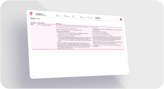 Disclosure# Disclosure Topic 2021 Response 305-1 Direct (scope 1) GHG emissions Gross direct (scope 1) GHG emissions in metric tons of CO 2 equivalent: 70,350 MT CO 2 e Gases included in the calculation: CO 2 , CH 4 , N 2 O , HFCs Biogenic CO 2 emissions in metric tons of CO 2 equivalent: 0 MT CO 2 e Base year for the calculation: 2016 ■ The rationale for choosing it: 2016 was the first year of available data for all direct emissions sources across the T-Mobile and Sprint portfolios ■ Emissions in the base year: 61,266 MT CO 2 e ■ The context for any significant changes in emissions that triggered recalculations of base year emissions: The 2016 emissions figures for T-Mobile and Sprint were combined to ensure consistency when comparing base year emissions to current and future reporting periods Source of the emission factors and the global warming potential (GWP) rates used, or a reference to the GWP source: Publicly available emission factors and global warming potential values from the U.S. Environmental Protection Agency (EPA) and the International Panel on Climate Change (IPCC) are used to convert from the native unit of measure (gallons, mmBTU, or MWh) to MT CO 2 e . Emission factors: ■ U.S. EPA Center for Corporate Climate Leadership: “Emission Factors for Greenhouse Gas Inventories”, (2020) 100-year global warming potential values: ■ IPCC: “Fifth Assessment Report (AR5)”, (2014) Consolidation approach for emissions: Operational control Standards, methodologies, assumptions, and/or calculation tools used: scope 1 emissions data is collected, calculated, and reported in accordance with the GHG Protocol and T-Mobile’s standard procedures and guidelines for sustainability reporting. All scope 1 emissions data is verified annually by an independent third party. All scope 1 emissions from sources designated to be within T-Mobile’s operational control are included. All data is historical in nature and based on primary data. For more information, refer to our most recent CDP Climate Change response on our reporting page . GRI Index Continued 2021 CORPORATE RESPONSIBILITY REPORT OUR PEOPLE OUR GOVERNANCE OUR COMMUNITIES THE ENVIRONMENT THE NUMBERS AND SMALL PRINT 78 OUR COMPANY