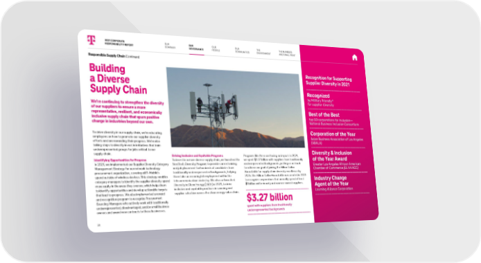 Building a Diverse Supply Chain We’re continuing to strengthen the diversity of our suppliers to ensure a more representative, resilient, and economically inclusive supply chain that spurs positive change in industries beyond our own. To drive diversity in our supply chain, we’re educating employees on how to promote our supplier diversity efforts and are rewarding their progress. We’re also taking steps to directly invest in initiatives that train underrepresented groups for jobs critical to our supply chain. Identifying Opportunities for Progress In 2021, we implemented our Supplier Diversity Category Management Strategy for our network technology procurement organization, covering all T-Mobile’s spend outside of wireless devices. This strategy enables category managers to identify the supplier diversity spend more easily in the areas they oversee, which helps them to identify opportunities and develop actionable targets that lead to progress. We also implemented a reward and recognition program to recognize Procurement Sourcing Managers who actively work with traditionally underrepresented, disadvantaged, and/or small business owners and award new contracts to these businesses. Driving Inclusive and Equitable Programs To invest in a more diverse supply chain, we launched the NextTech Diversity Program to provide career training and job placement for hundreds of candidates from traditionally underrepresented backgrounds, helping them take on meaningful employment within the telecommunications industry. We also co-launched Diversity in Clean Energy (DiCE) in 2021, to drive inclusive and equitable practices in sourcing and supplier selection across the clean energy value chain. Programs like these are having an impact. In 2021, we spent $3.27 billion with suppliers from traditionally underrepresented backgrounds, putting us on track to achieve our goal of joining the Billion Dollar Roundtable for supply chain diversity excellence by 2025. The Billion Dollar Roundtable was created in 2001 to recognize corporations that annually spend at least $1 billion with minority and women-owned suppliers. $3.27 billion spent with suppliers from traditionally underrepresented backgrounds Responsible Supply Chain Continued Recognition for Supporting Supplier Diversity in 2021 Recognized by Military Friendly® for supplier diversity Best of the Best top 50 corporations for inclusion— National Business Inclusion Consortium Corporation of the Year Asian Business Association of Los Angeles (ABALA) Diversity & Inclusion of the Year Award Greater Los Angeles African American Chamber of Commerce (GLAAACC) Industry Change Agent of the Year Learning Alliance Corporation 2021 CORPORATE RESPONSIBILITY REPORT OUR PEOPLE OUR COMMUNITIES THE NUMBERS AND SMALL PRINT 24 OUR COMPANY THE ENVIRONMENT OUR GOVERNANCE