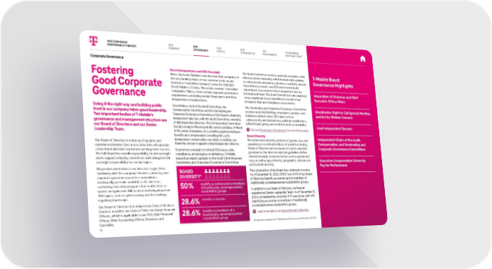 Corporate Governance Fostering Good Corporate Governance Doing it the right way and building public trust in our company takes good leadership. Two important bodies of T-Mobile’s governance and management structure are our Board of Directors and our Senior Leadership Team. Our Board of Directors is made up of dynamic and experienced leaders from across industries who provide counsel and direction to promote our long-term success. The full Board has overall responsibility for risk oversight and is supported by key committees with delegated risk oversight responsibility for certain topics. We provide orientation to our directors to give them f amiliarity with the company’s business, industry, and corporate governance practices and policies. Additionally, we make available to the directors continuing education programs that enable them to update and gain new skills in areas including important ESG topics, such as cybersecurity, and the evolving regulatory landscape. Our Board of Directors has adopted our Code of Business C onduct as well as our Code of Ethics for Senior Financial Officers, which is applicable to our CEO, Chief Financial Officer, Chief Accounting Officer, Treasurer, and Controller. Board Independence and ESG Oversight Since Deutsche Telekom controls more than a majority of t he outstanding shares of our common stock, we are deemed a “controlled company” under the NASDAQ Stock Market LLC rules. These rules exempt “controlled companies,” like us, from certain corporate governance requirements, including certain Board and committee independence requirements. Nevertheless, each of the Audit Committee, the C ompensation Committee, and the Nominating and Corporate Governance Committee of the Board is chaired by independent directors, with the Audit Committee consisting of all independent directors. The Compensation Committee has also retained Mercer (a wholly owned subsidiary of Marsh & McLennan Companies, Inc.), a well-recognized employee benefits and compensation consulting firm, as its independent compensation consultant. In addition, our Board has chosen to appoint a lead independent director. To promote oversight of critical ESG issues, risks, c ompliance, and progress on initiatives, T-Mobile executives report updates to the Audit Committee and Nominating and Corporate Governance Committee. BOARD DIVERSIT * 50% identify as women and/or members of traditionally underrepresented racial/ethnic groups 28.6% identify as women 28.6% identify as members of a traditionally underrepresented racial/ethnic group The Audit Committee receives quarterly enterprise-wide risk assessment reporting, which includes risks relating to cybersecurity and privacy, business continuity, annual fraud risk assessment, and SOX and Internal Audit reporting or assessments from management and our internal audit lead. The Audit Committee is also apprised of any significant issues identified as a result of our Enterprise Risk and Compliance assessments. The Nominating and Corporate Governance Committee r eceives quarterly briefings on progress, updates, and initiatives related to key ESG topics such as cybersecurity and data privacy, political contributions, philanthropic giving, and environmental sustainability. See our Governance Documents for more information. Board Diversity We understand diversity, inclusive of gender, race, and e xperience, is a critical attribute of a well-functioning Board of Directors and a measure of sound corporate governance. Our director selection guidelines define diversity broadly to include factors such as gender and race, as well as age, ethnicity, geographic, cultural, and professional diversity. The composition of the Board has continued to evolve. A s of December 31, 2021, 50% (7 out of 14) of our Board of Directors identify as women and/or members of traditionally underrepresented racial/ethnic groups. In addition to our Board of Directors, we have an e xperienced Senior Leadership Team. As of December 31, 2021, our leadership consisted of 17 executives with 41% identifying as women or members of traditionally underrepresented racial/ethnic groups. Learn more about our executives and directors . Y *All data points relating to the T-Mobile Board of Directors are as of December 31, 2021. T-Mobile Board Governance Highlights Separation of Chairman and Chief Executive Officer Roles Stockholder Right to Call Special Meeting a nd Act by Written Consent Lead Independent Director Independent Chairs of the Audit, C ompensation, and Nominating and Corporate Governance Committees Executive Compensation Driven by P ay for Performance 2021 CORPORATE RESPONSIBILITY REPORT OUR PEOPLE OUR C OMMUNITIES THE NUMBERS A ND SMALL PRINT 18 OUR COMPANY THE ENVIRONMENT OUR GOVERNANCE