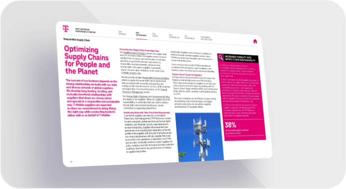 Responsible Supply Chain Optimizing Supply Chains for People and the Planet The success of our business depends on the strong relationships we build with our wide and diverse network of global suppliers. We develop long-lasting, trusting, and mutually beneficial relationships with suppliers that share our strong values and operate in a responsible and sustainable way. T-Mobile suppliers are expected to share our commitment to doing things the right way while conducting business either with or on behalf of T-Mobile. Governing Our Supply Chain in the Right Way Our Supplier Code of Conduct governs our supply chain and sets out expectations for supplier conduct in areas ranging from customer care and integrity to reducing greenhouse gas (GHG) emissions and water use, responsibly sourcing materials, and protecting human rights. We expect suppliers to promptly report concerns about violations of the Code to the T-Mobile Integrity Line . We also provide detailed Responsible Sourcing Guidelines which recognize the human rights and environmental risks associated with extracting, transporting, and trading certain natural resources such as conflict minerals and paper fiber. For more information, see the Natural Resources Management section. Our Human Rights Statement and Environmental Policy also apply to our suppliers. While our suppliers have the responsibility to undertake their own work to address human rights and environmental issues, we are committed to supporting their efforts. Monitoring Risks with Third-Party Risk Management Even before suppliers are selected, a centralized Third-Party Risk Management (TPRM) process screens for anti-corruption, global sanctions and human rights violations, and financial, security, reputational, and environmental risks. Supplier risk assessments are performed on an ongoing basis depending on the risk profile of the supplier, with the goal of ensuring we are not conducting business with any supplier that could pose a risk to our operations or reputation. Our TPRM process also continually monitors current suppliers for policy violations and risks through automated, real-time workflows that look for any adverse news or changes in supplier risk profiles. Additionally, Supplier Code of Conduct compliance is affirmed through standard supplier contract terms, TPRM assessment questionnaires, and Procurement’s vendor onboarding forms. Events or issues detected by TPRM monitoring are escalated to the enterprise Legal, Compliance, and business teams for review and recommended handling. Science-Based Targets for Suppliers Setting science-based emissions reduction targets has helped us dramatically reduce our GHG emissions. That’s why we encourage our suppliers to set their own science-based reduction targets by working with the Science Based Targets initiative (SBTi), and to bring them in line with the world’s ambition to limit global warming to 1.5°C. The more companies we can influence toward setting and achieving science-based targets, the bigger emissions reductions we can achieve together, and the better off our planet will be. INCREASED VISIBILITY INTO SUPPLY CHAIN SUSTAINABILITY EcoVadis is a leading provider of business sustainability ratings, helping businesses to better evaluate the environmental, social, and ethical performance of their own operations and those in their supply chain. In 2020, we began using their supplier assessment to better evaluate our supply chain across four key areas: environment, labor and human rights, ethics, and sustainable procurement. Each supplier who participates is evaluated with a rigorous evidence- based scorecard that identifies strengths and areas of opportunity. This gives us a chance to better engage with our suppliers on key issues in the four categories and drive improvements that benefit us all. In 2021, we strengthened our practices around supplier scoring and officially integrated the EcoVadis evaluation into our TPRM process. Going forward, we are continuing to increase the number of suppliers assessed. 38% of sourceable spend assessed by EcoVadis in 2021 2021 CORPORATE RESPONSIBILITY REPORT OUR PEOPLE OUR COMMUNITIES THE NUMBERS AND SMALL PRINT 23 OUR COMPANY THE ENVIRONMENT OUR GOVERNANCE