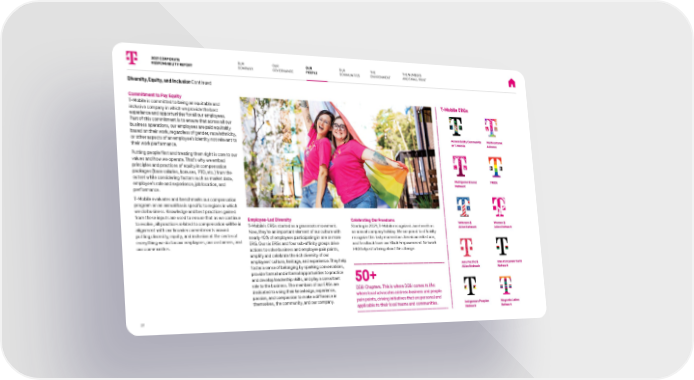 OUR COMPANY OUR G OVERNANCE OUR PE OPLE OUR C OMMUNITIES THE E NVIRONMENT THE NUMBERS A ND SMALL PRINT Commitment to Pay Equity T-Mobile is committed to being an equitable and in clusive company in which we provide the best experience and opportunities for all our employees. Part of this commitment is to ensure that across all our business operations, our employees are paid equitably based on their work, regardless of gender, race/ethnicity, or other aspects of an employee’s identity not relevant to their work performance. Putting people first and treating them right is core to our va lues and how we operate. That’s why we embed principles and practices of equity in compensation packages (base salaries, bonuses, PTO, etc.) from the outset while considering factors such as market data, employee’s role and experience, job location, and performance. T-Mobile evaluates and benchmarks our compensation p rogram on an annual basis specific to regions in which we do business. Knowledge and best practices gained from these inputs are used to ensure that as we continue to evolve, all practices related to compensation will be in alignment with our broader commitments around putting diversity, equity, and inclusion at the center of everything we do for our employees, our customers, and our communities. Employee-Led Diversity T-Mobile’s ERGs started as a grassroots movement. Now, they’re an important element of our culture with nearly 40% of employees participating in one or more ERG. Our six ERGs and four sub-affinity groups drive actions to solve business and employee pain points, amplify and celebrate the rich diversity of our employees’ culture, heritage, and experience. They help foster a sense of belonging by sparking conversations, provide formal and informal opportunities to practice and develop leadership skills, and play a consultant role to the business. The members of our ERGs are dedicated to using their knowledge, experience, passion, and compassion to make a difference in themselves, the community, and our company. Celebrating Our Freedoms Starting in 2021, T-Mobile recognized Juneteenth as a n annual company holiday. We are proud to officially recognize this truly momentous American milestone, and feedback from our Black Empowerment Network ERG helped to bring about this change. 50+ DE&I Chapters. This is where DE&I comes to life: where local advocates address business and people pain points, driving initiatives that are personal and applicable to their local teams and communities. T-Mobile ERGs Accessibility Community at T- M ob ile Multigenerational Network Veterans & Allies Network Asia Pacific & Allies Network Indigenous Peoples Network Multicultural Alliance PRIDE Women & Allies Network Black Empowerment Network Magenta Latinx Network Diversity, Equity, and Inclusion Continued 2021 CORPORATE RESPONSIBILITY REPORT 31