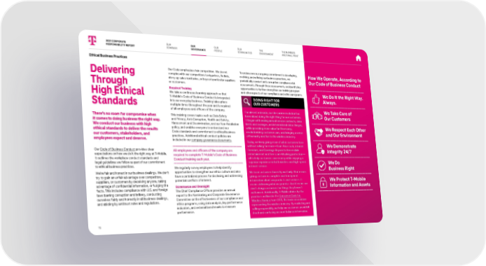 Ethical Business Practices Delivering Through High Ethical Standards There’s no room for compromise when it comes to doing business the right way. We conduct our business with high ethical standards to deliver the results our customers, stakeholders, and employees expect and deserve. Our Code of Business Conduct provides clear expectations on how we do it the right way at T-Mobile. It outlines the workplace conduct standards and legal guidelines we follow as part of our commitment to ethical business practices. We’re fair and honest in our business dealings. We don’t try to gain an unfair advantage over competitors, suppliers, or customers by deceiving anyone, taking advantage of confidential information, or fudging the facts. This includes compliance with U.S. and foreign laws barring corruption and bribery, conducting ourselves fairly and honestly in all business dealings, and abiding by antitrust rules and regulations. Our Code emphasizes fair competition. We do not conspire with our competitors to rig prices, fix bids, divvy up sales territories, or boycott particular suppliers or customers. Required Training We take a continuous learning approach so that T-Mobile’s Code of Business Conduct is integrated into our everyday business. Training takes place multiple times throughout the year and is required of all employees and officers of the company. This training covers topics such as Data Safety a nd Privacy, Anti-Corruption, Health and Safety, Harassment and Discrimination, and our Non-Retaliation policy, and enables everyone to understand our Code standards and commitment to ethical business practices. Additional ethical conduct policies are included in our company governance documents . All employees and officers of the company are required to complete T-Mobile’s Code of Business Conduct training each year. We regularly survey employees to help identify opportunities to strengthen our ethics culture and also have a centralized process for disclosing and addressing potential conflicts of interest. Governance and Oversight The Chief Compliance Officer provides an annual report to the Nominating and Corporate Governance Committee on the effectiveness of our compliance and ethics programs, using data analysis, key performance indicators, and external benchmarks to measure performance. To underscore our ongoing commitment to developing, evolving, and refining our business practices, we periodically conduct anti-corruption compliance risk assessments. Through these assessments, we identify key opportunities to further strengthen our training program and other aspects of our compliance and ethics programs. DOING RIGHT FOR OUR CUSTOMERS 2021 CORPORATE RESPONSIBILITY REPORT OUR PEOPLE OUR COMMUNITIES THE NUMBERS AND SMALL PRINT 15 OUR COMPANY THE ENVIRONMENT For almost a decade, our Un-carrier revolution has been about doing the right thing for our customers. It began with ending annual service contracts, data limits and overages, and international data charges, while providing more value for the money, revolutionizing customer care, and bringing a sense of humanity and fun to the wireless industry. Today, we keep giving more of what customers love without asking for more—from Price Lock, Internet Freedom, and Coverage Beyond to free mobile entertainment and free scam-blocking protection— all to help customers save money while enjoying a superior experience in both wireless and high-speed internet service. We treat customers honestly and fairly. That means giving customers complete and transparent information about our products and services. It means delivering what we promise. And it means we don’t charge customers for things they haven’t authorized. Additionally, T-Mobile abides by the practices outlined in the Consumer Code for Wireless Service from CTIA, the trade association representing the wireless industry. By marketing and selling responsibly, we help our customers avoid bill shock and confusing account balance information. How We Operate, According to Our Code of Business Conduct We Do It the Right Way. Always. We Take Care of Our Customers We Respect Each Other and Our Environment We Demonstrate Integrity 24/7 We Do Business Right We Protect T-Mobile Information and Assets OUR GOVERNANCE