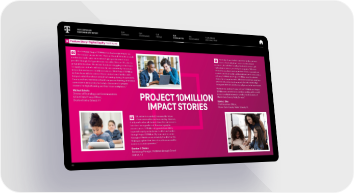 OUR COMPANY OUR GOVERNANCE OUR PEOPLE OUR COMMUNITIES THE ENVIRONMENT THE NUMBERS AND SMALL PRINT The T-Mobile Project 10Million has had a major impact on the students in our district. Brocton Central School is a small rural district with some areas where high speed internet is not possible through the typical means via cable, fiber, or DSL, due to geographic location. The district has been struggling to find funds to supply our students with internet in our community for remote instruction and access to online resources. With Project 10Million we have been able to connect those students and families with hotspots which have been critical for learning during the pandemic. Even as we have transitioned back to in-person learning, an internet connection is a necessity for today’s classrooms to prepare students for higher learning and their future workplaces.” Michael Schultz Director of Technology and Communications & Chief Data Privacy Officer, Brocton Central School, NY PROJECT 10MILLION IMPACT STORIES Education is essential, it ensures the future of our communities and our country. However, it only works when all students have the same access to instruction regardless of their demographic circumstances. T-Mobile safeguarded our ability to provide equity and inclusion to all of our families through Project 10Million. My team and the entire Borough of Middlesex are infinitely thankful for this. Helping people in their time of need is a rare quality in internet service providers.” Damien J. Dimino Technology Manager, Middlesex Borough School District, NJ For many of our students and their families, internet access is not only about access to educational resources, but a lifeline to online telehealth services, job exploration resources, or safety net programs. When we decided to accelerate and expand our efforts to provide our students and their families with reliable internet connectivity at home, T-Mobile and Project 10Million were the obvious choice for us to partner with. What we needed was a partner who not only understood our needs, but who would align their goals with ours and be mutually invested in our mission. We know our work isn’t done yet, but T-Mobile and Project 10Million are committed to continue working with us until access to reliable internet is a reality for all students of Miami-Dade County Public Schools.” Sylvia J. Diaz Chief Academic Officer, Miami-Dade County Public Schools, FL 2021 CORPORATE RESPONSIBILITY REPORT 43 Feature Story: Digital Equity Continued
