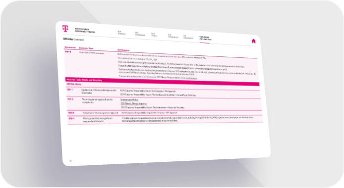 Disclosure# Disclosure Topic 2021 Response 305-5 Reduction of GHG emissions GHG emissions reduced as a direct result of reduction initiatives, in metric tons of CO 2 equivalent: 937,965 MT CO 2 e Gases included in the calculation: CO 2 , CH 4 , N 2 O Base year or baseline, including the rationale for choosing it: The GHG emissions in the year prior to the implementation of the reduction initiatives is used as the baseline. Scopes in which reductions took place; whether direct (scope 1), energy indirect (scope 2), and/or other indirect (scope 3): scope 2 and scope 3 Standards, methodologies, assumptions, and/or calculation tools used: GHG emissions reduction data is collected, calculated, and reported in accordance with the GHG Protocol and the most recent CDP Climate Change Reporting Guidance for Emissions Reduction Initiatives (C4.3). For more information, refer to our most recent CDP Climate Change response on our reporting page . Material Topic: Waste and Recycling GRI 306: Waste 103-1 Explanation of the material topic and its Boundaries 2021 Corporate Responsibility Report: Our Company > ESG Approach 2021 Corporate Responsibility Report: The Numbers and Small Print > Material Topic Definitions 103-2 The management approach and its components Environmental Policy CDP Climate Change Response 2021 Corporate Responsibility Report: The Environment > Waste and Recycling 103-3 Evaluation of the management approach 2021 Corporate Responsibility Report: Our Company > ESG Approach 306-1 Waste generation and significant waste-related impacts T-Mobile manages its operational waste in an environmentally responsible manner, including Municipal Solid Waste (MSW), regulated waste, shred paper, and electronic waste. We manage impacts related to waste generated in our own activities. GRI Index Continued 2021 CORPORATE RESPONSIBILITY REPORT OUR PEOPLE OUR GOVERNANCE OUR COMMUNITIES 81 OUR COMPANY THE ENVIRONMENT THE NUMBERS AND SMALL PRINT