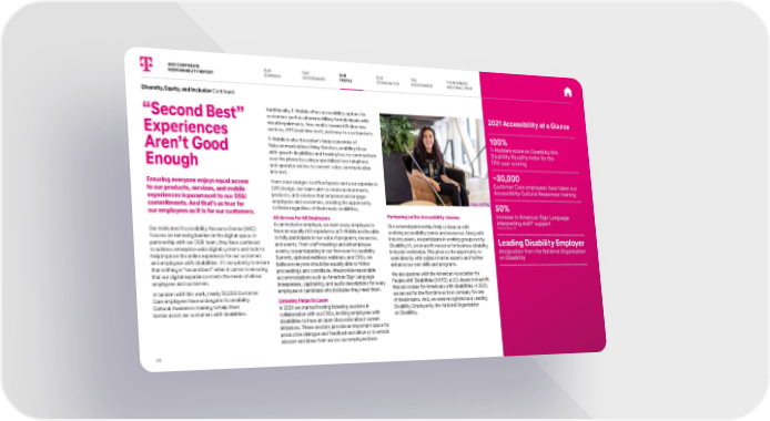 OUR COMPANY OUR GOVERNANCE OUR PE OPLE OUR C OMMUNITIES THE E NVIRONMENT THE NUMBERS A ND SMALL PRINT “Second Best” Experiences Aren’t Good Enough Ensuring everyone enjoys equal access to our products, services, and mobile experiences is paramount to our DE&I commitments. And that’s as true for our employees as it is for our customers. Our dedicated Accessibility Resource Center (ARC) focuses on removing barriers in the digital space. In partnership with our DE&I team, they have continued to address enterprise-wide digital systems and tools to help improve the online experience for our customers and employees with disabilities. It’s our priority to ensure that nothing is “second best” when it comes to ensuring that our digital experience meets the needs of all our employees and customers. In tandem with this work, nearly 30,000 Customer C are employees have undergone Accessibility Cultural Awareness training to help them better assist our customers with disabilities. Additionally, T-Mobile offers accessibility options for c ustomers such as alternate billing for individuals with visual impairments, free credits toward 411 directory services, RTT (real-time text), and easy-to-use handsets. T-Mobile is also the nation’s largest provider of T elecommunications Relay Services, enabling those with speech disabilities and hearing loss to communicate over the phone by using a specialized text telephone and operator service to convert voice communication into text. From store designs to office layouts and user experience ( UX) design, our teams aim to create environments, products, and services that empower and engage employees and customers, creating the opportunity to thrive regardless of their needs or abilities. All Access for All Employees As an inclusive employer, we want every employee to h ave an equally rich experience at T-Mobile and be able to fully participate in our suite of programs, resources, and events. From staff meetings and all-employee events, to participating in our first-ever Accessibility Summit, optional wellness webinars, and ERGs, we believe everyone should be equally able to follow proceedings and contribute. We provide reasonable accommodations such as American Sign Language interpreters, captioning, and audio descriptions for every employee or candidate who indicates they need them. Listening Helps Us Learn In 2021 we started hosting listening sessions in c ollaboration with our ERGs, inviting employees with disabilities to have an open discussion about current initiatives. These sessions provide an important space for productive dialogue and feedback and allow us to unlock wisdom and ideas from across our employee base. Diversity, Equity, and Inclusion Continued 2021 CORPORATE RESPONSIBILITY REPORT 34 Partnering on Our Accessibility Journey Our external partnerships help us keep up with e volving accessibility trends and resources. Along with industry peers, we participate in working groups run by Disability:IN, a non-profit resource for business disability inclusion worldwide. This gives us the opportunity to work directly with subject matter experts and further enhance our own skills and programs. We also partner with the American Association for P eople with Disabilities (AAPD), a U.S.-based non-profit that advocates for Americans with disabilities. In 2021, we served for the first time as host company for one of their interns. And, we were recognized as a Leading Disability Employer by the National Organization on Disability. 2021 Accessibility at a Glance 100% T-Mobile’s score on Disability:IN’s Disability Equality Index for the fifth year running ~30,000 Customer Care employees have taken our Accessibility Cultural Awareness training 50% increase in American Sign Language interpreting staff * support *measured by FTE Leading Disability Employer designation from the National Organization on Disability