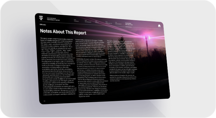 GRI Index Notes About This Report This report contains certain forward-looking statements based on T-Mobile management’s current assumptions and expectations, including statements regarding our ESG targets, goals, commitments and programs and other business plans, initiatives, and objectives. These statements are typically accompanied by the words “aim,” “hope,” “believe,” “estimate,” “plan,” “aspire,” “may,” “could,” “will,” or similar words. All such statements are intended to enjoy the protection of the safe harbor for forward-looking statements within the meaning of Section 21E of the Securities Exchange Act of 1934, as amended. Our actual future results, including the achievement of our targets, goals, or commitments, could differ materially, and adversely, from our projected results as the result of changes in circumstances, assumptions not being realized, or other risks, uncertainties, and factors. Such risks, uncertainties, and factors include the risk factors discussed in Item 1A of our most recent Annual Report on Form 10-K and subsequent quarterly reports on Form 10-Q filed with the Securities and Exchange Commission (SEC) (such documents are also available on our investor page), as well as, with respect to our ESG targets, goals and commitments outlined in this reporting or elsewhere, and the challenges, assumptions and other methodological considerations associated with same. As such, readers should not place undue reliance on such forward-looking statements. We urge you to consider all of the risks, uncertainties, and factors identified above or discussed in such reports carefully in evaluating the forward-looking statements in this report. T-Mobile cannot assure you that the results reflected or implied by any forward-looking statement will be realized or, even if substantially realized, that those results will have the forecasted or expected consequences and effects. The forward-looking statements in our reporting are made as of the date in which this report is published and we undertake no obligation and expressly disclaim any duty to update these forward-looking statements to reflect subsequent events or circumstances. Additionally, this report contains ESG-related statements based on hypothetical scenarios and assumptions as well as estimates that are subject to a high level of inherent uncertainty, and these statements should not necessarily be viewed as being representative of current or actual risk or performance, or forecasts of expected risk or performance. In addition, historical, current, and forward-looking environmental and social-related statements may be based on standards and metrics for measuring progress, as well as standards for the preparation of any underlying data for those metrics, that are still developing and internal controls and processes that continue to evolve; while these are based on expectations and assumptions believed to be reasonable at the time of preparation, they should not be considered guarantees. Moreover, our disclosures based on any standards may change due to revisions in framework requirements, availability of information, changes in our business or applicable governmental policies, or other factors, some of which may be beyond our control. THE ENVIRONMENT OUR GOVERNANCE OUR COMMUNITIES OUR PEOPLE 2021 CORPORATE RESPONSIBILITY REPORT 65 OUR COMPANY THE NUMBERS AND SMALL PRINT The events, scenarios, and efforts discussed in this report, including both forward-looking statements and other statements, may be significant; however, the inclusion of such statements is not an indication that these contents are necessarily material for the purposes of complying with or reporting pursuant to the U.S. federal securities laws and regulations, even if we use the word “material” or “materiality” in this document in relation to those statements or in other materials that we may release from time to time in connection with the matters discussed herein. Moreover, given the uncertainties, estimates, and assumptions required to make some of the disclosures in this report, and the timelines involved, materiality is inherently difficult to assess far in advance. In addition, given the inherent uncertainty of the estimates, assumptions, and timelines contained in this report, we may not be able to anticipate in advance whether or the degree to which we will or will not be able to meet our plans, targets, or goals. Website references throughout this document are provided for convenience only, and the content on the referenced websites is not incorporated by reference into this document.