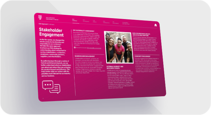 ESG Approach Continued Stakeholder Engagement As the Un-carrier, we changed the wireless industry by listening and responding to our customers. We take the same approach to inform our ESG strategy by understanding what is important to our key stakeholders—customers, employees, community partners, suppliers, and shareholders. By gathering input through a variety of formal and informal channels, we can better understand what our stakeholders care about and where they see us having the greatest impact and influence. This helps better align our actions with the priorities most relevant for our industry and our business. ESG MATERIALITY ASSESSMENT One of the most important tools we use to listen to our stakeholders is a third-party ESG materiality assessment. Conducted every couple of years, this assessment directly asks our leaders, employees, customers, and other key stakeholders to rank the ESG issues they care about and tell us what topics they think are most important for T-Mobile to address. See our most recent ESG materiality assessment . SHAREHOLDER ENGAGEMENT T-Mobile believes in frequent, consistent, and transparent communication with shareholders. Our senior management and investor relations team engage extensively and regularly with shareholders on topics that include ESG matters. Engagement takes place through one-on-one conversations and group meetings, major industry conferences, quarterly earnings, and through T-Mobile’s first Analyst Day, which we hosted in March 2021. THE ENVIRONMENT THE NUMBERS AND SMALL PRINT OUR GOVERNANCE OUR COMMUNITIES OUR PEOPLE 2021 CORPORATE RESPONSIBILITY REPORT 8 OUR COMPANY EXTERNAL DIVERSITY AND INCLUSION COUNCIL T-Mobile partners with our External Diversity and Inclusion Council to help guide and support our Equity In Action (EIA) objectives. The Council includes leaders from the National Urban League, League of United Latin American Citizens, National Action Network, Unidos U.S., OCA-Asian-Pacific American Advocates, Asian Americans Advancing Justice, Human Rights Campaign, National Organization on Disability, National Association for the Advancement of Colored People, National Diversity Coalition, and Multicultural Media, Telecom and Internet Council. EMPLOYEE RESOURCE GROUPS AND LOCAL DE&I CHAPTERS The passionate and dedicated volunteer leaders of our Employee Resource Groups (ERGs) identify diversity, equity, and inclusion (DE&I) opportunities where our company can make the biggest impact. T-Mobile has six ERGs with four sub-affinity groups and 50+ local DE&I Chapters around the country. In addition to hosting events, these groups provide a forum for ongoing dialogue and feedback on important issues to ensure that diverse voices across the company are heard. COMMUNITY ENGAGEMENT Community engagement and feedback is important to our business. That’s why we work to foster strong relations with local communities and external partners so that we’re informed of critical issues impacting our customers, company, and industry. By consulting with local officials, community partners, and industry associations about our business and potential impact, we can incorporate feedback into key initiatives and champion change where it’s needed most.