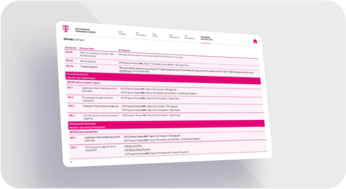 GRI Index Continued Disclosure# Disclosure Topic 2021 Response 102-54 Claims of reporting in accordance with the GRI Standards This report has been prepared in accordance with the GRI Standards: Core option. 102-55 GRI content index 2021 Corporate Responsibility Report: The Numbers and Small Print > GRI Content Index 102-56 External assurance Third-party limited assurance was provided for T-Mobile’s greenhouse gas (GHG) emissions and energy use data for calendar year 2021. See T-Mobile’s Assurance Statement on our reporting page for more information. Economic Disclosures Material Topic: Digital Equity GRI 203: Indirect economic impacts 103-1 Explanation of the material topic and its boundaries 2021 Corporate Responsibility Report: Our Company > ESG Approach 2021 Corporate Responsibility Report: The Numbers and Small Print > Material Topic Definitions 103-2 The management approach and its components 2021 Corporate Responsibility Report: Our Communities > Digital Equity 103-3 Evaluation of the management approach 2021 Corporate Responsibility Report: Our Company > ESG Approach 2021 Corporate Responsibility Report: Our Communities > Digital Equity 203-1 Infrastructure investments and services supported 2021 Corporate Responsibility Report: Our Communities > Digital Equity Environmental Disclosures Material Topic: Energy Management GRI 302: Energy management 103-1 Explanation of the material topic and its boundaries 2021 Corporate Responsibility Report: Our Company > ESG Approach 2021 Corporate Responsibility Report: The Numbers and Small Print > Material Topic Definitions 103-2 The management approach and its components Environmental Policy CDP Climate Change Response 2021 Corporate Responsibility Report: The Environment > Energy Management 2021 CORPORATE RESPONSIBILITY REPORT OUR PEOPLE OUR GOVERNANCE OUR COMMUNITIES THE ENVIRONMENT THE NUMBERS AND SMALL PRINT 74 OUR COMPANY