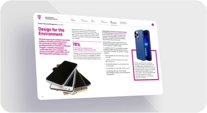 OUR COMPANY OUR G OVERNANCE OUR PE OPLE OUR C OMMUNITIES THE E NVIRONMENT THE NUMBERS A ND SMALL PRINT Design for the Environment We know many of our customers care about making sustainable purchasing choices. We encourage our device suppliers to participate in the UL ECOLOGO Certification Program, a voluntary independent certification that covers materials use, energy consumption, repairability, end-of- life management, packaging, and more. Approximately 78% of our new wireless handset models were certified through UL ECOLOGO and EPEAT Certifications in 2021. Going forward, T-Mobile will extend the range of wireless devices that undergo ECOLOGO or equivalent certification to include tablets and wearables. 78% of our new wireless handset models certified through UL ECOLOGO and EPEAT T-Mobile is on the ECOLOGO Standard Technical Panel for UL 110 (the Standard for Sustainability for Mobile Phones) and was involved in developing the industry’s first-ever environmental standard for wireless devices. Collaborating for Progress in Sustainable Packaging Sustaina ble packaging is one way we show our love for our customers and our planet at the same time. We strive to reduce packaging waste that goes to landfill and not saddle our customers with plastic trays and inserts they cannot recycle. We are working to evolve our device and accessory pa ckaging and shipping materials to be sourced from more sustainable, recyclable materials. In coordination with CTIA, we developed sustainable pa ckaging guidelines that help minimize the impact and footprint of packaging. The guidelines encourage suppliers to: ■ Create packaging that has as little single-use plastic as possible ■ Avoid any constructions that prevent recycling, like metal wire ties ■ Clearly label packaging so consumers know their recycling options ■ Use paper fibers from reputable, certified sources ■ Consider alternative, less environmentally harmful printing processes, such as using water-or soy-based inks Pivet, the case brand with its proprietary Self-Cycle TM technology, was among the new sustainable products we introduced to our accessories portfolio in 2021. It’s a case option that delivers premium design and functionality while being 100% bioavailable to nature’s “decay agents” found in locations like landfills. Pivet is an example of new materials technology opening up more sustainable choices for customers. Product Lifecycle Management Continued 2021 CORPORATE RESPONSIBILITY REPORT 60