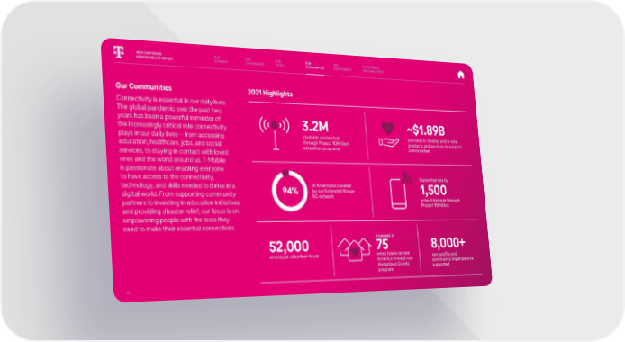OUR COMPANY OUR GOVERNANCE OUR PEOPLE OUR COMMUNITIES THE ENVIRONMENT THE NUMBERS AND SMALL PRINT Our Communities Connectivity is essential in our daily lives. The global pandemic over the past two years has been a powerful reminder of the increasingly critical role connectivity plays in our daily lives—from accessing education, healthcare, jobs, and social services, to staying in contact with loved ones and the world around us. T-Mobile is passionate about enabling everyone to have access to the connectivity, technology, and skills needed to thrive in a digital world. From supporting community partners to investing in education initiatives and providing disaster relief, our focus is on empowering people with the tools they need to make their essential connections. 2021 Highlights 3.2M students connected through Project 10Million education programs 94% of Americans covered by our Extended Range 5G network ~$1.89B provided in funding and in-kind products and services to support communities Supported nearly 1,500 school districts through Project 10Million e 5 mp 2 loy , ee v 000 olunteer hours In e n s 75 v sted i mall towns across America through our Hometown Grants program 2021 CORPORATE RESPONSIBILITY REPORT 41 8,000+ non-profits and community organizations supported