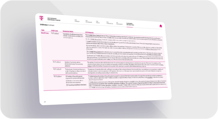 Topic SASB Code Requested Metric 2021 Response Data Privacy T C -T L-2 2 0 a .1 Description of policies and practices relating to behavioral advertising and customer privacy The T-Mobile Privacy Center houses our Privacy Notices about our privacy practices for consumers. Here consumers can find the choices they have over the use of their personal data and our Privacy Notice describing what data we collect, how it is used, when it is shared, how we retain and protect it, and other privacy safeguards. See the T-Mobile Privacy Notice for how the company collects, uses, shares, and protects personal data. T-Mobile has policies and practices in place for data handling and to govern the data lifecycle including the use of Privacy by Design principles and processes to evaluate new projects using Privacy Impact Assessments. We don’t knowingly collect data from or about children without the permission of their parent or guardian. When we do collect that data, we might do it directly, like when they sign up for a service. We might also collect it automatically if a child uses the products or services we offer. See our Children’s Privacy Notice for more information. The T-Mobile Privacy Center gives consumers easy to access information concerning behavioral advertising and their choices. This includes the choices consumers have over the use of their personal data for relevant advertising and data analytics and reporting. For more information see our Advertising and Analytics article . For relevant ads, T-Mobile will use and analyze data from your device, and usage data generated by use of T-Mobile products and services, and sometimes data from third-party partners, to create inferences for our own and third-party advertising until customers tell us not to use it. This data helps us understand more about user interests (e.g. sports enthusiast, loves cooking, etc.). This data does not directly identify users. T C -T L-2 2 0 a . 2 Number of customers whose information is used for secondary purposes The number of customers whose information is used for secondary purposes varies by product as consumers may opt out of these uses. For example, we offer consumer choices about data use for analytics and reporting or relevant advertising. We publicly disclose information on the types of secondary uses in our Privacy Notice as well as the number of requests we’ve received from customers to access or delete their personal data, or opt-out. T C -T L-2 2 0 a . 3 Total amount of monetary losses as a result of legal proceedings associated with customer privacy For purposes of reporting this metric, we’ll report on regulatory fines or legal settlements for matters that have a material impact on our operations, or which we’d otherwise disclose to investors pursuant to SEC guidance. We do not, as of this report, have any material monetary loss as the result of litigation or regulatory investigations concerning our processing of consumer data. T C -T L-2 2 0 a . 4 (1) Number of law enforcement requests for customer information (2) Number of customers whose information was requested (3) Percentage resulting in disclosure T-Mobile discloses the number of law enforcement requests for customer information and the number of requests that were rejected, received no response, or received a written explanation of why T-Mobile was unable to respond in whole or in part. For the latest annual figures, visit our website to view the most current annual Transparency Report. T-Mobile releases customer records to third parties only when legally authorized or compelled to do so. Our Legal and Emergency Response team relies on Federal and State statutes and regulations when determining appropriate compliance. The Legal and Emergency Response Specialists are trained to analyze legal demands and make a determination regarding appropriate compliance. Generally, T-Mobile notifies customers of third-party legal demands only if required by law or contract to do so. T-Mobile does not measure the number of individual customers whose information is requested. SASB Index Continued 2021 CORPORATE RESPONSIBILITY REPORT OUR PEOPLE OUR GOVERNANCE OUR COMMUNITIES 89 OUR COMPANY THE ENVIRONMENT THE NUMBERS AND SMALL PRINT