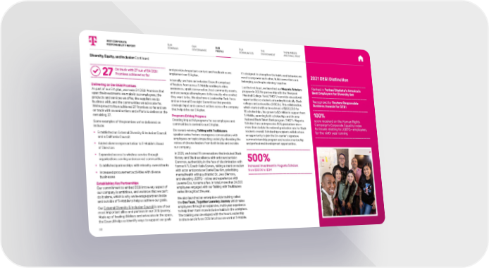 Diversity, Equity, and Inclusion Continued 27 On track with 27 out of 54 DE&I Promises achieved so far Delivering on Our DE&I Promises As part of our EIA plan, we made 54 DE&I Promises that s pan the investments we make in our employees, the products and services we offer, the suppliers we do business with, and the communities we advocate for. We’re proud to have achieved 27 Promises so far and are on track with several actions and efforts to deliver on the remaining 27. Some examples of the promises we’ve delivered on i nclude: ■ Established an External Diversity & Inclusion Council and a California Council ■ Added diverse representation to T-Mobile’s Board of Directors ■ Expanded access to wireless service through organizations serving underserved communities ■ Established partnerships with minority-owned banks ■ Increased procurement activities with diverse businesses Establishing Key Partnerships Our commitment to embed DE&I into every aspect of o ur company is ambitious, and we know that we can’t do it alone, which is why we leverage partners inside and outside of T-Mobile to help us achieve our goals. Our External Diversity & Inclusion Council is one of our m ost important allies and partners in our DE&I journey. Made up of leading thinkers and advocates in the space, the Council helps us identify ways to support our goals and provides important context and feedback as we im plement our EIA plan. Internally, we have an Inclusion Council comprised o f leaders from across T-Mobile working to drive awareness, spark conversation, host community events, and encourage all employees to be exactly who or what they want to be. We also have a Leadership Task Force and an Internal Oversight Committee that provide strategic input and connect actions across the company that help drive our EIA plan. Programs Driving Progress Creating impactful programs for our employees and c ommunities is central to our EIA plan. Our award-winning Talking with Trailblazers s peaker series fosters courageous conversations with employees on topics impacting society by elevating the voices of diverse leaders from both inside and outside our company. In 2021, we hosted 11 conversations that included Black h istory and Black excellence with artist and activist Common, authenticity in the face of discrimination with former NFL Coach Katie Sowers, taking a stand on racism with actor and producer Daniel Dae Kim, prioritizing mental health with psychiatrist Dr. Jess Clemons, and elevating LGBTQ+ voices and experiences with Laverne Cox, to name a few. In total, more than 24,000 employees engaged with our Talking with Trailblazers series throughout the year. We also launched an enterprise-wide training called t he One Team, Together Learning Journey which takes employees through an expansive, multi-year experience to help them form more inclusive habits in the workplace. The training was developed with the NeuroLeadership Institute and infuses DE&I into how we work at T-Mobile. It’s designed to strengthen the habits and behaviors we need to empower each other, build connections and belonging, and inspire winning, together. Last but not least, we launched our Magenta Scholars p rogram in 2021 in partnership with the Thurgood Marshall College Fund (TMCF) to provide educational opportunities to students attending historically Black colleges and universities (HBCUs). This collaboration, which started with an investment of $500,000 for 18 scholarships, has grown to $3 million in support from T-Mobile, spanning both scholarships and the new National Black Talent Bank program. TMCF’s Magenta Scholars have an impressive 85% graduation rate— more than double the national graduation rate for Black students overall. Scholarship recipients will also have an opportunity to join the Un-carrier’s signature summer internship program and receive mentorship and professional development opportunities. 500% increased investment in Magenta Scholars from $500K to $3M 2021 DE&I Distinction Ranked in Forbes/Statista’s America’s Best Employers for Diversity list Recognized by Reuters Responsible B usiness Awards for DE&I 100% score received on the Human Rights Campaign’s Corporate Equality Index for issues relating to LGBTQ+ employees, for the ninth year running 2021 CORPORATE RESPONSIBILITY REPORT OUR COMMUNITIES THE NUMBERS AND SMALL PRINT 30 OUR COMPANY THE ENVIRONMENT OUR GOVERNANCE OUR PEOPLE