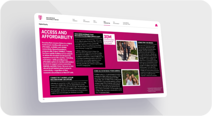 OUR COMPANY OUR GOVERNANCE OUR PEOPLE OUR COMMUNITIES THE ENVIRONMENT THE NUMBERS AND SMALL PRINT Digital Equity ACCESS AND AFFORDABILITY Ensuring that everyone thrives in a digital world means starting with access to affordable, available, and reliable connectivity. Beyond investing in programs like Project 10Million, T-Mobile has been rapidly building out our network to deliver the broadest and deepest 5G experience across the country—including rural areas—while providing more affordable options to families with limited incomes to support a more connected, digitally equitable future. Because no one should be left behind when it comes to connectivity—regardless of their economic circumstance or their ZIP code. CONNECT BY T-MOBILE: A PLAN MILLIONS MORE CAN AFFORD Delivering on our promise to make connectivity more accessible, Connect by T-Mobile helps close the digital divide by putting connectivity within easy reach of more people. The plan provides a low-cost option to help connect millions of low-income families and individuals—because no one should have to choose between staying connected and paying for other basic necessities. HIGH SPEED INTERNET THAT REACHES PLACES FIBER OPTICS CAN’T America’s vastness is a beautiful thing―unless you are installing broadband. Running a fiber connection to every home in the country is economically unfeasible, which leaves nearly 15% of households with only one choice for home broadband; in rural areas that jumps to nearly 35% vi . T-Mobile’s High Speed Internet changes that. When launched in April 2021, more than 30 million households were eligible for our service, including 10 million in rural America, turning T-Mobile into one of the largest broadband providers in the U.S. by service area. Access quickly expanded to more homes across the Southeast, Texas, Indiana, Kentucky, and Ohio, and continues to grow rapidly as our 5G coverage grows. 30 househol M ds eligible for our service at time of launch GOING ALL IN ON SMALL-TOWN AMERICA T-Mobile is going ALL IN to be the leader in America’s underserved smaller markets and rural areas. At the end of 2021, our 5G network spanned 1.8 million square miles, with 1.45 million of that covering small town America. As our network expansion continues, we plan to reach 99% of Americans with 5G by the end of 2023. This is where our network leadership stands out, as we’re the only 5G game in town for many of these communities. For more details on how we help smaller towns across America thrive, see the story on Hometown Grants . CONNECTING OUR HEROES We count on first responders, and they can count on us. We’re proud to offer our groundbreaking Connecting Heroes program, a 10-year commitment to provide free service and 5G access to first responder agencies—all public and non-profit state and local fire, 911, police and EMS departments—saving them up to $7 billion vii . In 2021, T-Mobile made enhancements to the program, including priority access AND preemption for both voice calls and data for first responders enrolled in the Wireless Priority Service (WPS) program. So not only do first responders get to the front of the line at T-Mobile, but if the network ever becomes crowded in an emergency, non-emergency traffic drops to make way for first responders’ critical communications. vi Highspeedinternet.com Why Can I Only Get a Few Internet Providers? | HighSpeedInternet.com vii Estimated savings if every department takes advantage of the program. 2021 CORPORATE RESPONSIBILITY REPORT 44