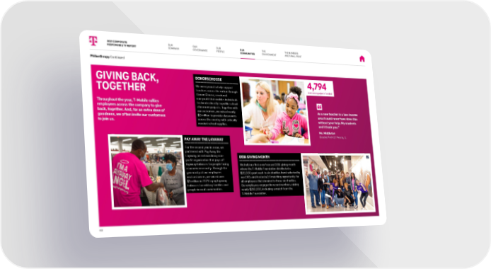 Philanthropy Continued OUR COMPANY OUR GOVERNANCE OUR PEOPLE OUR COMMUNITIES THE ENVIRONMENT THE NUMBERS AND SMALL PRINT GIVING BACK, TOGETHER Throughout the year, T-Mobile rallies employees across the company to give back, together. And, for an extra dose of goodness, we often invite our customers to join us. PAY AWAY T H E L AYAWAY For the second year in a row, we partnered with Pay Away the Layaway, an extraordinary non- profit organization that pays off layaway balances for people facing economic insecurity. Through the generosity of our employees and customers, we raised over $1 million in 2021 to pay layaway balances for military families and people in rural communities. 4 class , roo 7 m p 94 rojects funded DONORSCHOOSE We were proud to help support teachers across the nation through DonorsChoose, a national non-profit that enables individuals to donate directly to public school classroom projects. Together with our customers, we raised nearly $2 million to provide classrooms across the country with critically needed school supplies. As a new teacher in a low-income area I could never have done this without your help. My students and I thank you.” Ms. Middleton Grades PreK-2 | Peoria, IL DE&I GIVING MONTH We held our first-ever focused DE&I giving month where the T-Mobile Foundation distributed a $20,000 grant each to six charities hand-selected by our ERGs and hosted a 2:1 matching opportunity for all employees that donated to these six charities. Our employees engaged in record numbers, raising nearly $250,000, including a match from the T-Mobile Foundation. 2021 CORPORATE RESPONSIBILITY REPORT 48