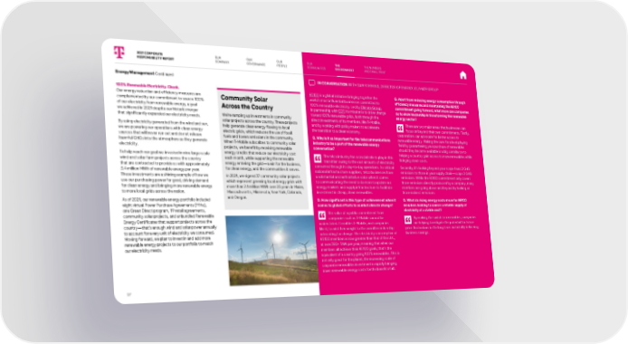 OUR COMPANY OUR G OVERNANCE OUR PE OPLE OUR C OMMUNITIES THE E NVIRONMENT THE NUMBERS A ND SMALL PRINT 100% Renewable Electricity. Check. Our energy reduction and efficiency measures are c omplemented by our commitment to source 100% of our electricity from renewable energy, a goal we achieved in 2021 despite our historic merger that significantly expanded our electricity needs. By using electricity generated from the wind and sun, w e are powering our operations with clean energy sources that will never run out and do not release harmful GHGs into the atmosphere as they generate electricity. To help reach our goal we invested in nine large-scale w ind and solar farm projects across the country that are contracted to provide us with approximately 3.4 million MWh of renewable energy per year. These investments are a shining example of how we use our purchasing power for good, driving demand for clean energy and bringing more renewable energy to more local grids across the nation. As of 2021, our renewable energy portfolio included e ight virtual Power Purchase Agreements (PPAs), one Green Direct program, 19 retail agreements, community solar projects, and unbundled Renewable Energy Certificates that support projects across the country―that’s enough wind and solar power annually to account for every unit of electricity we consumed! Moving forward, we plan to invest in and add more renewable energy projects to our portfolio to match our electricity needs. Community Solar Across the Country We’re ramping up investments in community solar projects across the country. These projects help generate clean energy flowing to local electric grids, which reduces the use of fossil fuels and lowers emissions in the community. When T-Mobile subscribes to community solar projects, we benefit by receiving renewable energy credits that reduce our electricity cost each month, while supporting the renewable energy entering the grid—a win for the business, for clean energy, and the communities it serves. In 2021, we signed 37 community solar projects w hich represent greening local energy grids with more than 2.1 million MWh over 25 years in Maine, Massachusetts, Minnesota, New York, Colorado, and Oregon. IN CONVERSATION WITH SAM KIMMINS, DIRECTOR OF ENERGY, CLIMATE GROUP RE100 is a global initiative bringing together the w orld’s most influential businesses committed to 100% renewable electricity. Led by Climate Group, i n partnership with CDP , its mission is to drive change t oward 100% renewable grids, both through the direct investments of its members, like T-Mobile, and by working with policymakers to accelerate the transition to a clean economy. Q. Why is it so important for the telecommunications i ndustry to be a part of the renewable energy conversation? The telco industry has a crucial role to play in this transition owing to the vast amounts of electricity consumed through its day-to-day operations. As critical national infrastructure suppliers, telco businesses have a substantial and authoritative voice when it comes to communicating the need to do more to update our energy markets and supply infrastructure to facilitate investment in cheap, clean renewables. Q. How significant is this type of achievement when it comes to global efforts to combat climate change? The value of a public commitment from companies such as T-Mobile cannot be understated. It enables T-Mobile, and companies like it, to add their weight to the overall membership advocating for change. The electricity consumption of RE100 members is now greater than that of the U.K., at over 380+ TWh per year, meaning that when our members all achieve their RE100 goals, that’s the equivalent of a country going 100% renewables. This is not only good for the planet; the increasing scale of corporate renewables investment is rapidly bringing down renewable energy costs for the benefit of all. Q. Apart from reducing energy consumption through efficiency measures and maintaining the RE100 commitment going forward, what more can companies do to show leadership in transforming the renewable energy sector? There are two major areas that businesses can focus on beyond their own commitments. Firstly, corporations can advocate for better access to renewable energy. Making the case for a level playing field by guaranteeing your purchase of renewables should they become available is a big contributor to helping a country gain access to more renewables while bringing down costs. Secondly, it’s looking beyond your scope 1 and 2 GHG emissions to those in your supply chain―scope 3 GHG emissions. While the RE100 commitment only covers those emissions directly produced by a company, many members are going above and beyond by looking at those indirect emissions. Q. What do rising energy costs mean for RE100 m embers looking to source a reliable supply of electricity at a stable cost? By making the switch to renewables, companies are helping to mitigate the potential for future price fluctuations in the long term and ideally delivering business savings. Energy Management Continued 2021 CORPORATE RESPONSIBILITY REPORT 57