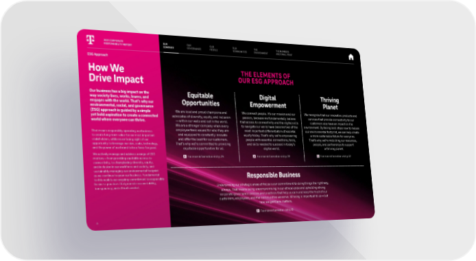 ESG Approach How We Drive Impact Our business has a big impact on the way society lives, works, learns, and engages with the world. That’s why our environmental, social, and governance (ESG) approach is guided by a simple yet bold aspiration to create a connected world where everyone can thrive. That means responsibly operating our business to create long-term value for our most important stakeholders, while never losing sight of our opportunity to leverage our size, scale, technology, and the power of our brand to be a force for good. We actively manage and address a range of ESG matters—from providing equitable access to connectivity, to championing diversity, equity, and inclusion in our workforce and society, and sustainably managing our environmental footprint as we continue to grow our business. Fundamental to this work is our ongoing commitment to responsible business practices that promote accountability, transparency, and ethical conduct. THE ELEMENTS OF OUR ESG APPROACH Equitable Opportunities We are loud and proud champions and advocates of diversity, equity, and inclusion —within our walls and out in the world. We are a stronger company when every employee feels valued for who they are and equipped to constantly innovate and offer the best for our customers. That’s why we’re committed to providing equitable opportunities for all. For more information visit p.26 Digital Empowerment We connect people. It’s our mission and our passion, because we fundamentally believe that access to connectivity and the digital skills to navigate our world have become two of the most important differentiators of societal equity today. That’s why we’re empowering people with essential connections, tools, and skills needed to succeed in today’s digital world. For more information visit p.39 Thriving Planet We recognize that our innovative products and services that provide connectivity to our customers also have an impact on the environment. By taking bold steps now to reduce our environmental footprint, we can help create a more sustainable future for everyone. That’s why we’re mobilizing our resources, people, and partnerships to support a thriving planet. For more information visit p.52 THE ENVIRONMENT THE NUMBERS AND SMALL PRINT OUR GOVERNANCE OUR COMMUNITIES OUR PEOPLE 2021 CORPORATE RESPONSIBILITY REPORT 6 OUR COMPANY Responsible Business Underpinning our strategic areas of focus is our commitment to doing things the right way, always. That means being uncompromising in our ethical code and upholding strong corporate governance policies and practices that help us earn and keep the trust of our customers, employees, and the communities we serve. Winning is important to us—but how we get there matters. For more information visit p.13