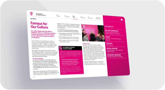 Our Culture Famous for Our Culture Our culture begins and ends with our employees. We are a celebratory, inclusive, magenta-loving team of people united in our commitment to change our industry for the better. Due to the pandemic and political and social unrest, the last two years have been difficult for people and companies everywhere. T-Mobile is no exception as we prioritized the health and safety of our employees while simultaneously integrating two companies into one unified culture. But if there is one constant that stayed true, it’s that Team Magenta is resilient, strong, proud, and unwavering in our commitment to our customers and to one another. And that’s why we have been so focused on getting it right. We are one team, together. The Future Is Magenta Our culture is something we never take for granted. It’s what unifies us in our mission to be the best in the world at connecting customers to their world, and what motivates us each and every day to be a part of something bigger. We work hard to stay connected to Team Magenta and have a variety of tools and forums to do that. One of the most important ways that we measure the health of our culture is through our confidential Our Voice surveys, which go out multiple times each year to all employees. The survey helps us to gauge how employees feel about our company, what they love about their jobs and what they don’t. It’s a big part of how we continue to evolve and grow. In October 2021, approximately 39,000 employees took the survey and relayed the following sentiment: ■ 87% of employees say their team clearly prioritizes the customer experience in its work ■ 86% of employees say their own team creates an inclusive work environment “for me to be myself” ■ 80% of employees would recommend T-Mobile as a great place to work AN AWARD-WINNING PLACE TO WORK T-Mobile has once again been recognized as a great place to work by leading national workplace awards and surveys. The following 2021 rankings are based on survey responses from the real experts: our employees. ■ America’s Best Employers list by Forbes ■ Comparably’s Best Global Culture list ■ Fortune 100 Best Companies to Work For ■ Glassdoor’s Best Places to Work list We attribute our success to our unique culture and values. They’ve ensured we’ve grown closer through challenging times and success alike—and they’ll guide us through an exciting new era of Un-carrier, too. Employee Forums In addition to Our Voice surveys and roundtable discussions with our directors and VP’s, our CEO and leadership team hosts quarterly All-Employee Meetings where they share the latest company news, celebrate wins, and discuss challenges ahead. These always feature an open Q&A session, the highest rated portion of the meeting, where everyone has a chance to engage on what’s top of mind. Past All-Employee Meetings have included a discussion of new service offerings, how the company is navigating the pandemic, and how—through our values—we can have a bigger, better, and more meaningful impact together. Building and maintaining a culture we can be famous for requires care and commitment. It’s something we take seriously and is work that’s constantly evolving. Our Culture is: Fun and celebratory We have a sense of humor and celebrate successes and one other Proud We love our T-Mobile branded gear. Like, a lot Inclusive We ALL belong Action-oriented We are relentless in our commitment to deliver results Customer-obsessed We fight on behalf of all customers 2021 CORPORATE RESPONSIBILITY REPORT OUR GOVERNANCE OUR COMMUNITIES THE NUMBERS AND SMALL PRINT 28 OUR COMPANY THE ENVIRONMENT OUR PEOPLE
