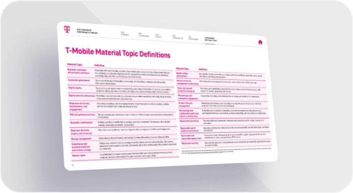 T-Mobile Material Topic Definitions Material Topic Definition Business continuity and network resilience Managing risks and creating systems of prevention and recovery to deal with potential threats to a company, i.e. disaster response efforts, geopolitical events, building network resilience, and mitigating risks that could interrupt network service. Corporate governance Structures in charge of managing, overseeing, and directing a company and integrating ESG across the business. Digital equity Equal access and opportunity to connectivity, including affordability of services, accessibility no matter ability, income or location, and digital education to bridge digital literacy divides. Digital security and privacy Providing a secured network for a safe and secure online experience, including the protection of personal information and consumer data. Employee attraction, development, and engagement Attracting, retaining, and developing the best talent through education, learning, training, and fair recruitment and compensation practices. Ethical business practices The fair, transparent, and moral code of conduct to the strategic and operational management of a business. Economic contribution Making a positive contribution to national and local economies. For instance, through jobs created, taxes paid, economic value added. Employee diversity (equity and inclusion) Diversity of our workforce and equal opportunity for employees of different backgrounds. Energy management Using energy more efficiently and opting for renewable energy sources where possible. Greenhouse gas (carbon) emissions and climate change Taking clear action to reduce our impact on the climate and reducing emissions, like carbon, generated from business activities. Developing innovative technologies that promote long-term sustainability. Human rights A commitment to respect and promote human rights and social principles in every place a company operates, including its business partners and supply chain. Material Topic Definition Health, safety, and wellness Ensuring the workers across the value chain work in safe conditions where their safety, health, and mental well-being are prioritized. Natural resources management conservation Protecting and conserving natural resources, such as water, trees, wildlife, and land. Open internet and competitive behavior Protecting and committing to open internet access where all data is treated equally with respect to content, application, and service. Philanthropy and community engagement Supporting, developing, and enhancing the well-being and livelihoods of communities. Product lifecycle management Minimizing environmental and social impacts during the product lifecycle (i.e. take-back programs, reduction of plastic and packaging). Partnerships and collaboration and cross- industry collaboration Promoting and advancing sustainability across the telecom industry through advocacy, participation in industry associations, external partnerships, and cross-industry collaboration. Responsible marketing The responsible and transparent communication, promotion, and/or selling of products to consumers. Responsible use of products and services Ensuring customers are using products and services responsibly and that their digital well-being is protected. Sustainable and responsible supply chain Transparent supply chain management and responsible supplier engagement that protects environmental, social, and governance (ESG) values. Waste and recycling Reducing the amount of waste generated across operations and responsibly disposing/recycling all waste streams. These definitions were used in our third-party materiality assessment which was intended to identify and prioritize ESG issues relevant to our business and key stakeholders. Please refer to the ESG materiality matrix in the 2020 Corporate Responsibility Report for more information. 2021 CORPORATE RESPONSIBILITY REPORT OUR PEOPLE OUR GOVERNANCE OUR COMMUNITIES THE ENVIRONMENT THE NUMBERS AND SMALL PRINT 70 OUR COMPANY