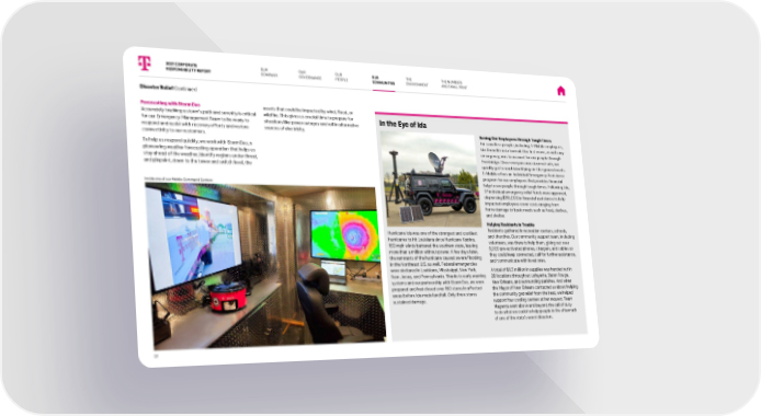 OUR COMPANY OUR GOVERNANCE OUR PEOPLE OUR COMMUNITIES THE ENVIRONMENT THE NUMBERS AND SMALL PRINT Forecasting with StormGeo Accurately tracking a storm’s path and severity is critical for our Emergency Management Team to be ready to respond and assist with recovery efforts and restore connectivity to our customers. To help us respond quickly, we work with StormGeo, a pioneering weather forecasting operation that helps us stay ahead of the weather, identify regions under threat, and pinpoint, down to the tower and switch level, the assets that could be impacted by wind, flood, or wildfire. This gives us crucial time to prepare for situations like power outages and roll in alternative sources of electricity. Inside one of our Mobile Command Centers Disaster Relief Continued In the Eye of Ida Hurricane Ida was one of the strongest and costliest hurricanes to hit Louisiana since Hurricane Katrina. 150 mph winds battered the southern state, leaving more than a million without power. A few days later, the remnants of the hurricane caused severe flooding in the Northeast U.S. as well. Federal emergencies were declared in Louisiana, Mississippi, New York, New Jersey, and Pennsylvania. Thanks to early warning systems and our partnership with StormGeo, we were prepared and had closed over 150 stores in affected areas before Ida made landfall. Only three stores sustained damage. Seeing Our Employees through Tough Times For countless people, including T-Mobile employees, Ida threw life into turmoil. Our first move, as with any emergency, was to account for our people through Everbridge. Once everyone was deemed safe, we quickly got to work identifying on-the-ground needs. T-Mobile offers an Individual Emergency Assistance program for our employees that provides financial help to see people through tough times. Following Ida, 77 individual emergency relief funds were approved, dispensing $115,000 in financial assistance to help impacted employees cover costs ranging from home damage to basic needs such as food, clothes, and shelter. Helping Residents in Trouble Residents gathered in recreation centers, schools, and churches. Our community support team, including volunteers, was there to help them, giving out over 5,000 pre-activated phones, chargers, and cables so they could keep connected, call for further assistance, and communicate with loved ones. A total of $1.3 million in supplies was handed out in 28 locations throughout Lafayette, Baton Rouge, New Orleans, and surrounding parishes. And when the Mayor of New Orleans contacted us about helping the community get relief from the heat, we helped support four cooling centers at her request. Team Magenta went above and beyond the call of duty to do what we could to help people in the aftermath of one of the state’s worst disasters. 2021 CORPORATE RESPONSIBILITY REPORT 51
