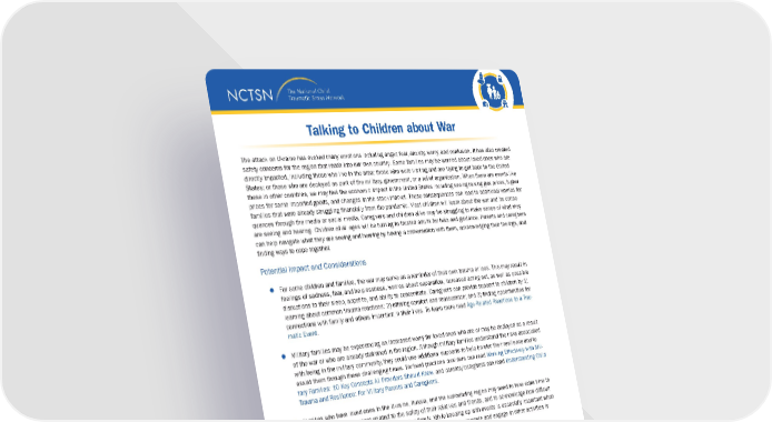 Talking to Children about War The attack on Ukraine has evoked many emotions including anger, fear, anxiety, worry, and confusion. It has also created safety concerns for the region that reach into our own country. Some families may be worried about loved ones who are directly impacted, including those who live in the area; those who were visiting and are trying to get back to the United States; or those who are deployed as part of the military, government, or a relief organization. When there are events like these in other countries, we may feel the economic impact in the United States including seeing raising gas prices, higher prices for some imported goods, and changes in the stock market. These consequences can lead to additional worries for families that were already struggling financially from the pandemic. Most children will learn about the war and its conse- quences through the media or social media. Caregivers and children alike may be struggling to make sense of what they are seeing and hearing. Children of all ages will be turning to trusted adults for help and guidance. Parents and caregivers can help navigate what they are seeing and hearing by having a conversation with them, acknowledging their feelings, and finding ways to cope together. Potential Impact and Considerations For some children and families, the war may serve as a reminder of their own trauma or loss. This may result in feelings of sadness, fear, and helplessness, worries about separation, increased acting out, as well as possible disruptions to their sleep, appetite, and ability to concentrate. Caregivers can provide support to children by 1) learning about common trauma reactions; 2) offering comfort and reassurance; and 3) finding opportunities for connections with family and others important in their lives. To learn more read Age-Related Reactions to a Trau- matic Event. Military families may be experiencing an increased worry for loved ones who are or may be deployed as a result of the war or who are already stationed in the region. Although military families understand the risks associated with being in the military community, they could use additional supports to help bolster their resilience and to assist them through these challenging times. For best practices providers can read Working Effectively with Mili- tary Families: 10 Key Concepts All Providers Should Know, and parents/caregivers can read Understanding Child Trauma and Resilience: For Military Parents and Caregivers. Families who have loved ones in the Ukraine, Russia, and the surrounding region may need to take extra time to discuss children’s concerns related to the safety of their relatives and friends, and to acknowledge how difficult the uncertainty and worry can be for the entire family. While keeping up with events is especially important when family is involved, finding some time each day to take a break from coverage and engage in other activities is important for everyone’s overall coping. Talking to Children about War Start the Conversation Check in by asking what your children know about the situation. Most school-age children and teens will have heard something from media outlets, social media, teachers, or peers. Do NOT presume you know what your children are thinking or feeling. Ask how they are feeling about what is happening in Ukraine and respond to the concerns they share. Remember, their worries and feelings may not be what you think. Validate feelings your children share. Plan to have multiple conversations if they have had a lot of questions or as the situation changes. Checking back in as changes occur helps children to know you are open to talk about difficult situations. This project was funded by the Substance Abuse and Mental Health Services Administration (SAMHSA), US Department of Health and Human Services (HHS). Talking to Children about War www.NCTSN.org The views, policies, and opinions expressed are those of the authors and do not necessarily reflect those of SAMHSA or HHS.