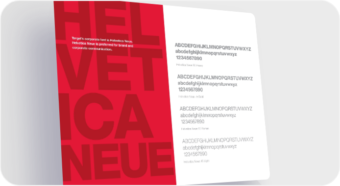 HEL VET ICA NEUE ABCDEFGHIJKLMNOPQRSTUVWXYZ abcdefghijklmnopqrstuvwxyz 1234567890 Helvetica Neue 85 Heavy ABCDEFGHIJKLMNOPQRSTUVWXYZ abcdefghijklmnopqrstuvwxyz 1234567890 Helvetica Neue 75 Bold ABCDEFGHIJKLMNOPQRSTUVWXYZ abcdefghijklmnopqrstuvwxyz 1234567890 Helvetica Neue 55 Roman ABCDEFGHIJKLMNOPQRSTUVWXYZ abcdefghijklmnopqrstuvwxyz 1234567890 Helvetica Neue 45 Light Target’s corporate font is Helvetica Neue. Helvetica Neue is preferred for brand and corporate communication.