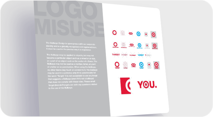 LOGO MISUSE The Bullseye Design is synonymous with our corporate identity and is a globally recognized and registered icon. It must be used in the precise way it is registered. The Bullseye may be applied to objects, but may not become a particular object such as a wheel or an eye, or a part of an object such as the center of a flower. The Bullseye may not be used as a number, letter, any part of a letter or as punctuation. When using the Bullseye, no other items may touch or connect to it. The Bullseye may be used in a sentence only if it is substitutable for the word “Target.” It is not acceptable to use any image that suggests a Bullseye (even if it’s not a bullseye) that does not comply with these rules. Please email Target.Brands@target.com with any questions related to the use of the Bullseye.