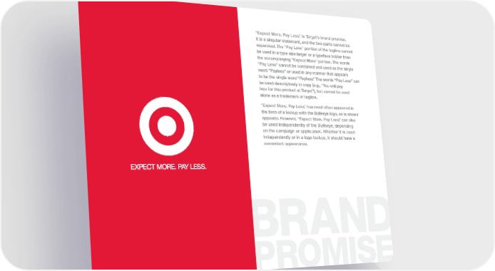 BRAND PROMISE “Expect More. Pay Less.” is Target’s brand promise. It is a singular statement, and the two parts cannot be separated. The “Pay Less” portion of the tagline cannot be used in a type size larger or a typeface bolder than the accompanying “Expect More” portion. The words “Pay Less” cannot be combined and used as the single word “Payless” or used in any manner that appears to be the single word “Payless.” The words “Pay Less” can be used descriptively in copy (e.g., “You will pay less for this product at Target”), but cannot be used alone as a trademark or tagline. “Expect More. Pay Less.” has most often appeared in the form of a lockup with the Bullseye logo, as is shown opposite. However, “Expect More. Pay Less.” can also be used independently of the Bullseye, depending on the campaign or application. Whether it is used independently or in a logo lockup, it should have a consistent appearance.