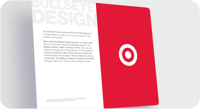 BULLSEYE DESIGN The Bullseye Design is integrated in the identity signatures of Target Stores, as well as in many of the logos for our products and services. When using the Bullseye, Target wordmark or “Expect More. Pay Less.” you must include the following legal line: “The Bullseye Design, Target and Expect More. Pay Less. are registered trademarks of Target Brands, Inc.” The legal line may be shortened to reflect what’s shown in a particular communication. For example, if only the Bullseye is shown, it may read, “The Bullseye Design is a registered trademark of Target Brands, Inc.” The ® mark is no longer needed. Outside of the U.S., slight variations in the logos may be necessary to satisfy local laws. Email [email protected] to ensure proper usage.