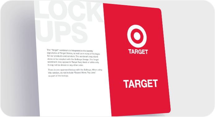 LOCK UPS The “Target” wordmark is integrated in the identity signatures of Target Stores, as well as in many of the logos for our products and services. The wordmark may stand alone or be coupled with the Bullseye Design. The Target wordmark may appear in Target Red, black or white only. It may not be shown in any other color. There is one approved lockup with the Bullseye. When using this version, do not include “Expect More. Pay Less.” as part of the lockup.