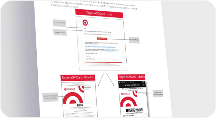 Target Usage Guidelines eGift Cards eGift Cards: All eGift Card emails and templates must follow Target Usage Guidelines. Target can provide codes, URL’s or send eGift Cards directly to the end user on your behalf. Target eGiftCards are mobile optimized and can be redeemed in store via mobile device or paper print out or online at Target.com Below is an example of when Target would send an eGift Card to the recipient on your behalf. To learn more about our eGift Card process, email [email protected] or call 1-800-5GIFTS5 (544-3875). Target eGiftCard Email recipient’s name sender’s name link to eGift Card Target eGiftCard- Desktop Target eGiftCard- Mobile choose from unique customized gift card designs messaging area 9
