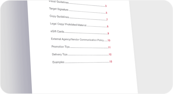 Target Usage Guidelines Table of Contents Visual Guidelines .........................................................3 Target Signature ..........................................................5 Copy Guidelines ..........................................................7 Legal Copy/ Prohibited Material .................................8 eGift Cards ...................................................................9 External Agency/Vendor Communication Policy ......10 Promotion Tips ...........................................................11 Delivery Tips ...............................................................12 Examples ....................................................................13 2