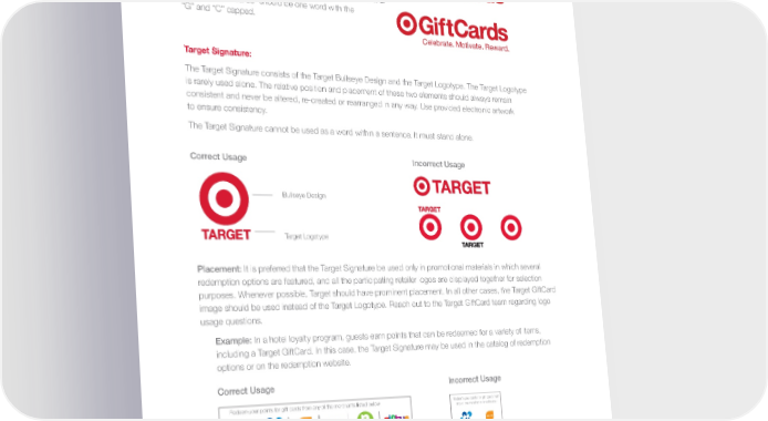 Target Usage Guidelines Target Signature Target GiftCards Logo: Use either the Target GiftCards standard logo or the Target GiftCards logo with the tagline “Celebrate. Motivate. Reward.” The word “GiftCards” should be one word with the “G” and “C” capped. Celebrate. Motivate. Reward. Target Signature: The Target Signature consists of the Target Bullseye Design and the Target Logotype. The Target Logotype is rarely used alone. The relative position and placement of these two elements should always remain consistent and never be altered, re-created or rearranged in any way. Use provided electronic artwork to ensure consistency. The Target Signature cannot be used as a word within a sentence. It must stand alone. Correct Usage Incorrect Usage Bullseye Design Target Logotype Placement: It is preferred that the Target Signature be used only in promotional materials in which several redemption options are featured, and all the participating retailer logos are displayed together for selection purposes. Whenever possible, Target should have prominent placement. In all other cases, the Target GiftCard image should be used instead of the Target Logotype. Reach out to the Target GiftCard team regarding logo usage questions. Example: In a hotel loyalty program, guests earn points that can be redeemed for a variety of items, including a Target GiftCard. In this case, the Target Signature may be used in the catalog of redemption options or on the redemption website. Correct Usage Incorrect Usage Redeem your points for gift cards from any of the merchants listed below: Redeem your points for gift cards from any of the merchants listed below: 5