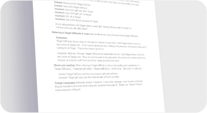 Target Usage Guidelines Copy Guidelines Copy Guidelines: Referring to Target GiftCards in offer: The offer must be stated in the correct order: “Do X, and receive a Target GiftCard.” Whenever the Target GiftCard is used as part of the offer, we would prefer you to say: Correct: Receive a $25 Target GiftCard. Correct: Get a $25 Target GiftCard. Incorrect: Get a $25 gift card from Target. Incorrect: Get a $25 gift card to Target. Incorrect: $25 off at Target. Incorrect: Get a $25 shopping spree at Target. Avoid using phrases with Target-related words, like “Savings that are right on target” or “Hit the bull’s-eye with ABC Bank!” Referring to Target GiftCards in copy: Use benefit-driven copy when promoting Target GiftCards. Examples: Target GiftCards let you shop for thousands of items at more than 1,800 Target stores in the U.S. and online at Target.com. From toys to electronics and clothing to housewares, find exactly what you’re looking for at Target. They’re the rewarding choice. Celebrate. Motivate. Reward. Target GiftCards are redeemable at over 1,800 Target stores in the U.S. and online at Target.com. They can also be used to buy groceries, the newest and coolest electronics product, or a stylish outfit from one of our design partners and more. Check your spelling: When referring to Target GiftCards, the correct spelling and capitalization is ” “Target GiftCards, “corporate gift cards,” “Target eGiftCards,” “eGift Cards,” “gift cards” or “gift card”. Correct: Target GiftCards are the most popular gift card out there. Incorrect: Target gift cards are the most popular GiftCard out there. Foreign Languages: Materials created in Spanish, or any other language, must include a complete English translation and must list the Spanish disclaimer (see page 8). “Target” and “Target GiftCard” must always be in English. 7